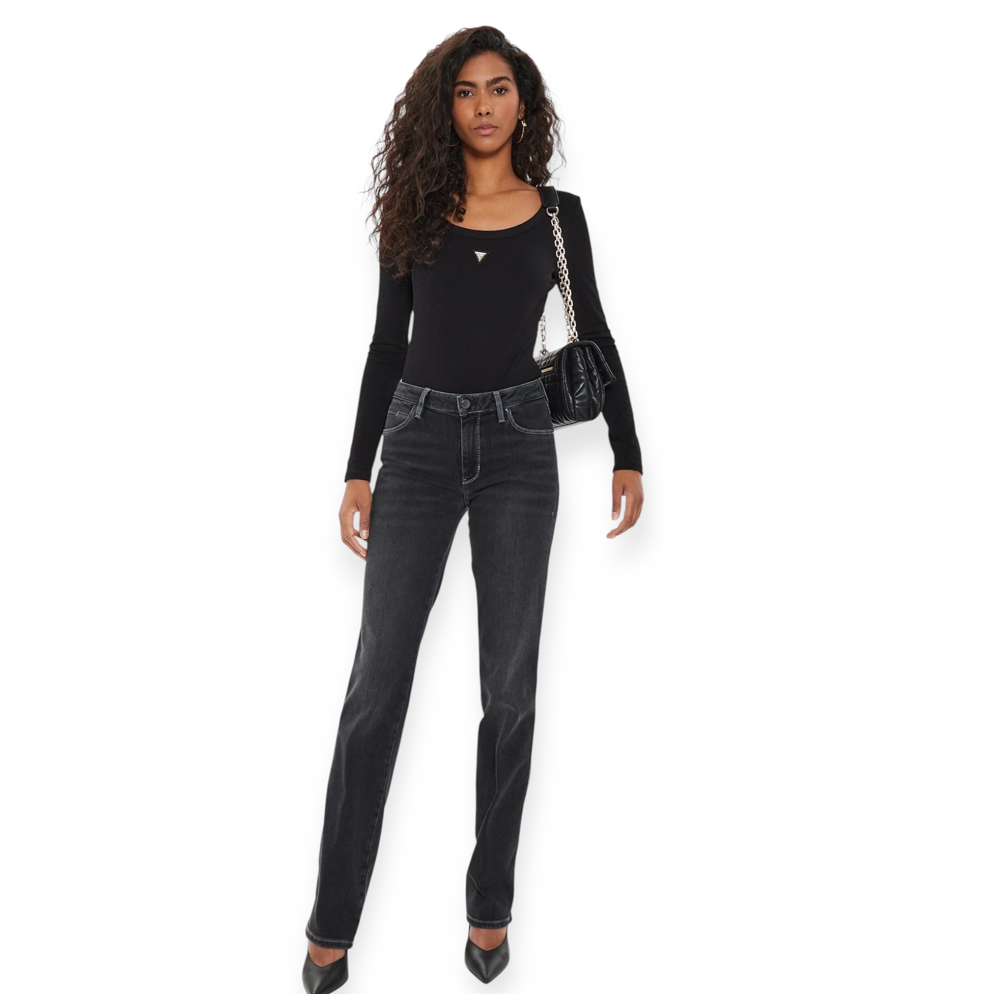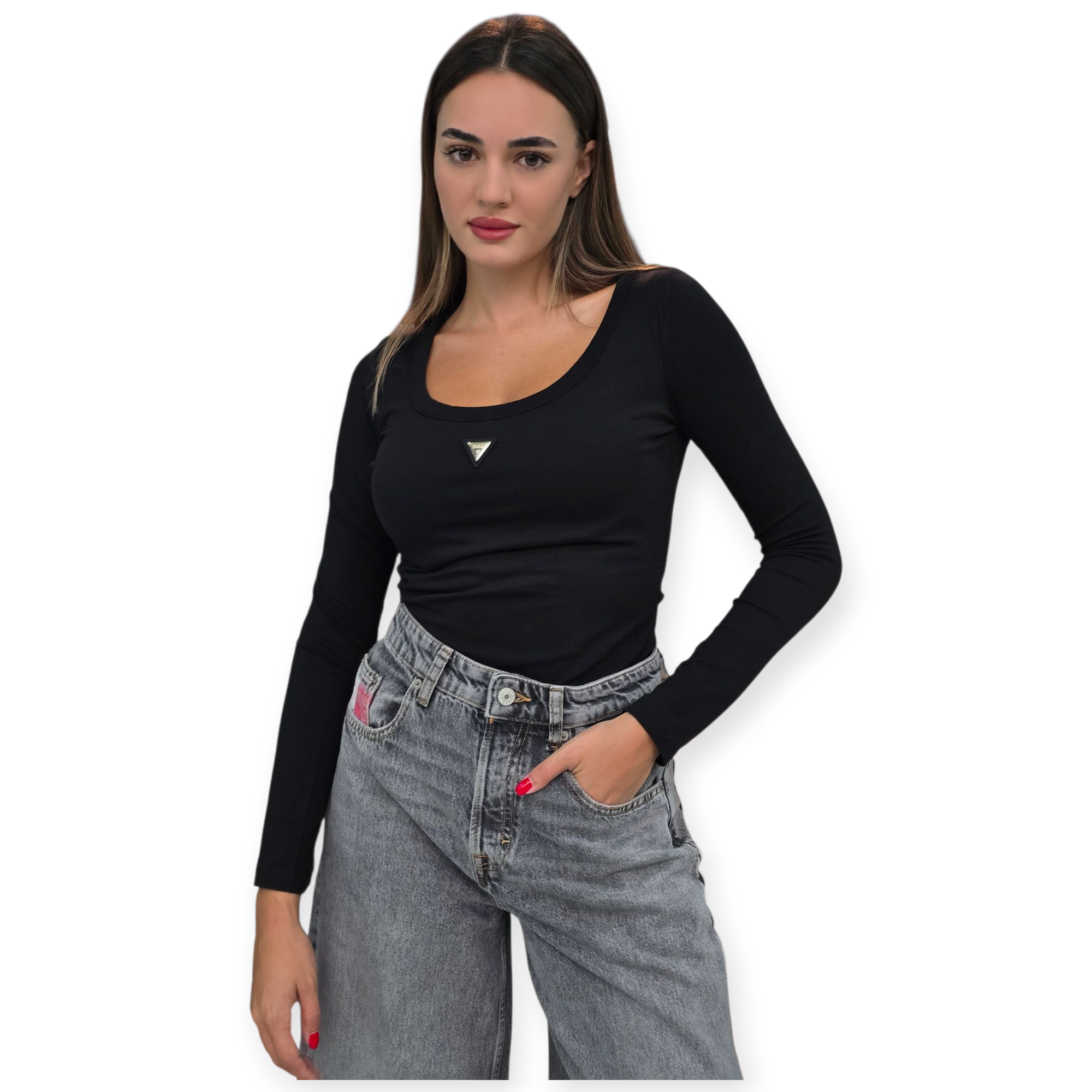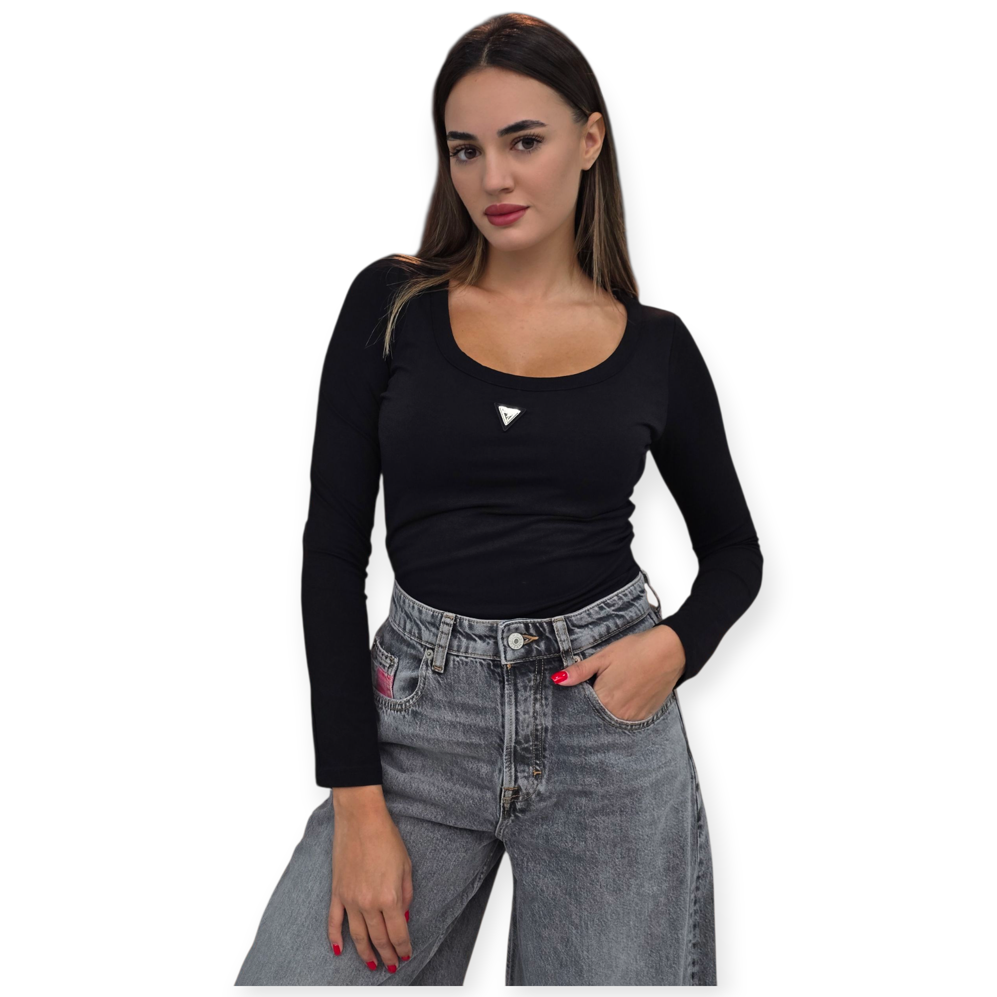 בגד גוף נשי של guess בצבע שחור, עם מפתח עגול מחמיא ולוגו משולש אייקוני בחזית. בד גמיש ונעים שמצמיד את הגוף בצורה אלגנטית – מושלם למראה יומיומי או לערב עם ג’ינס וחגורה.