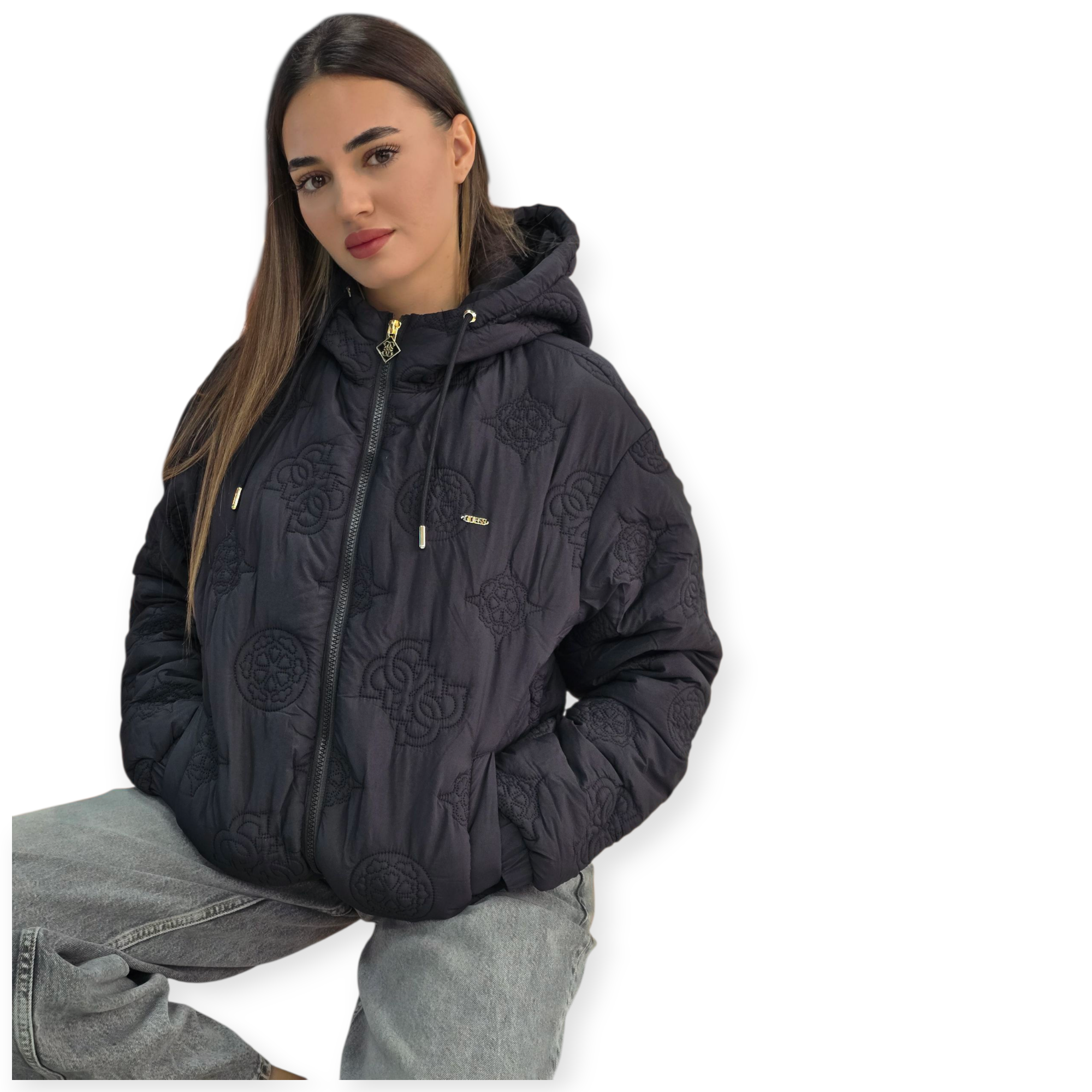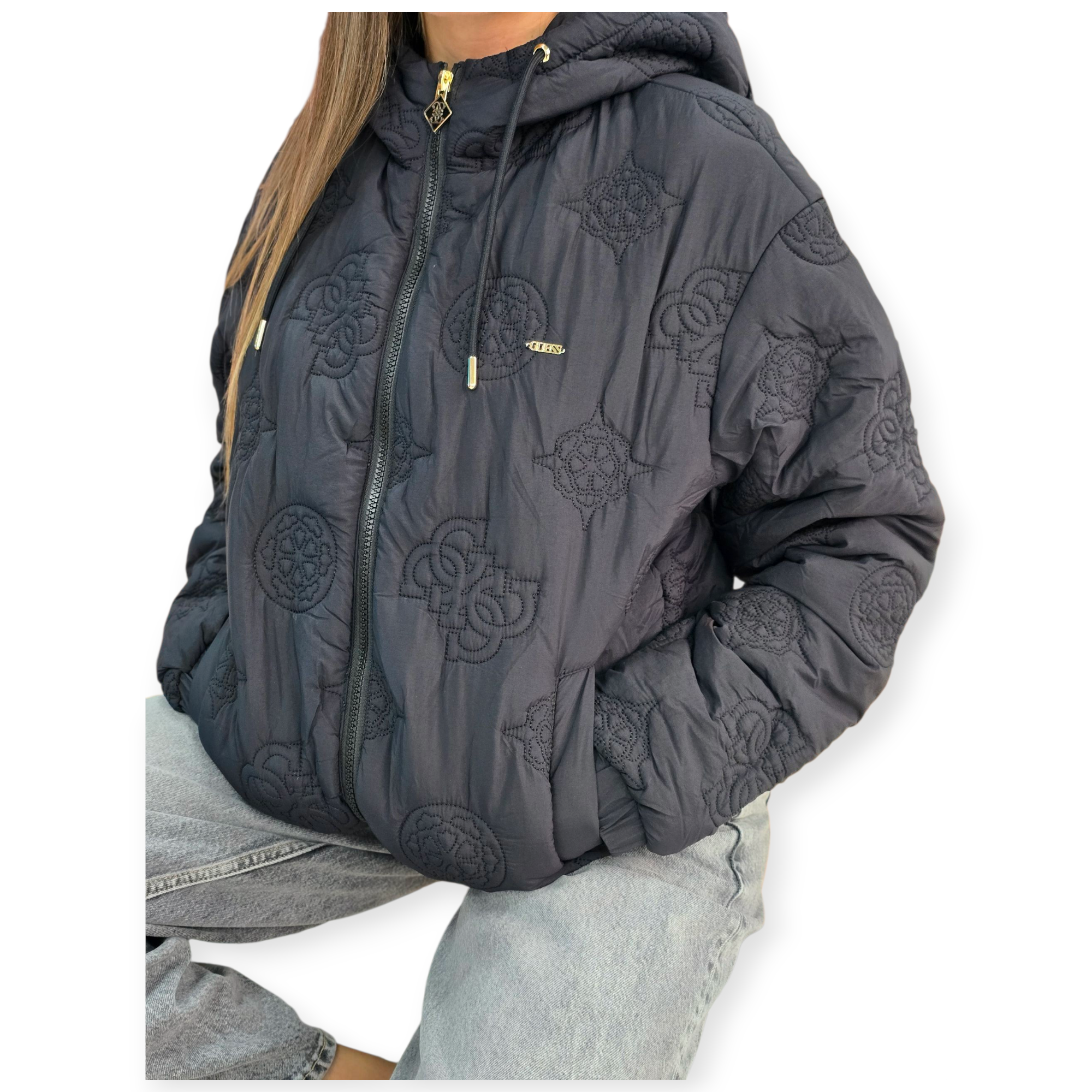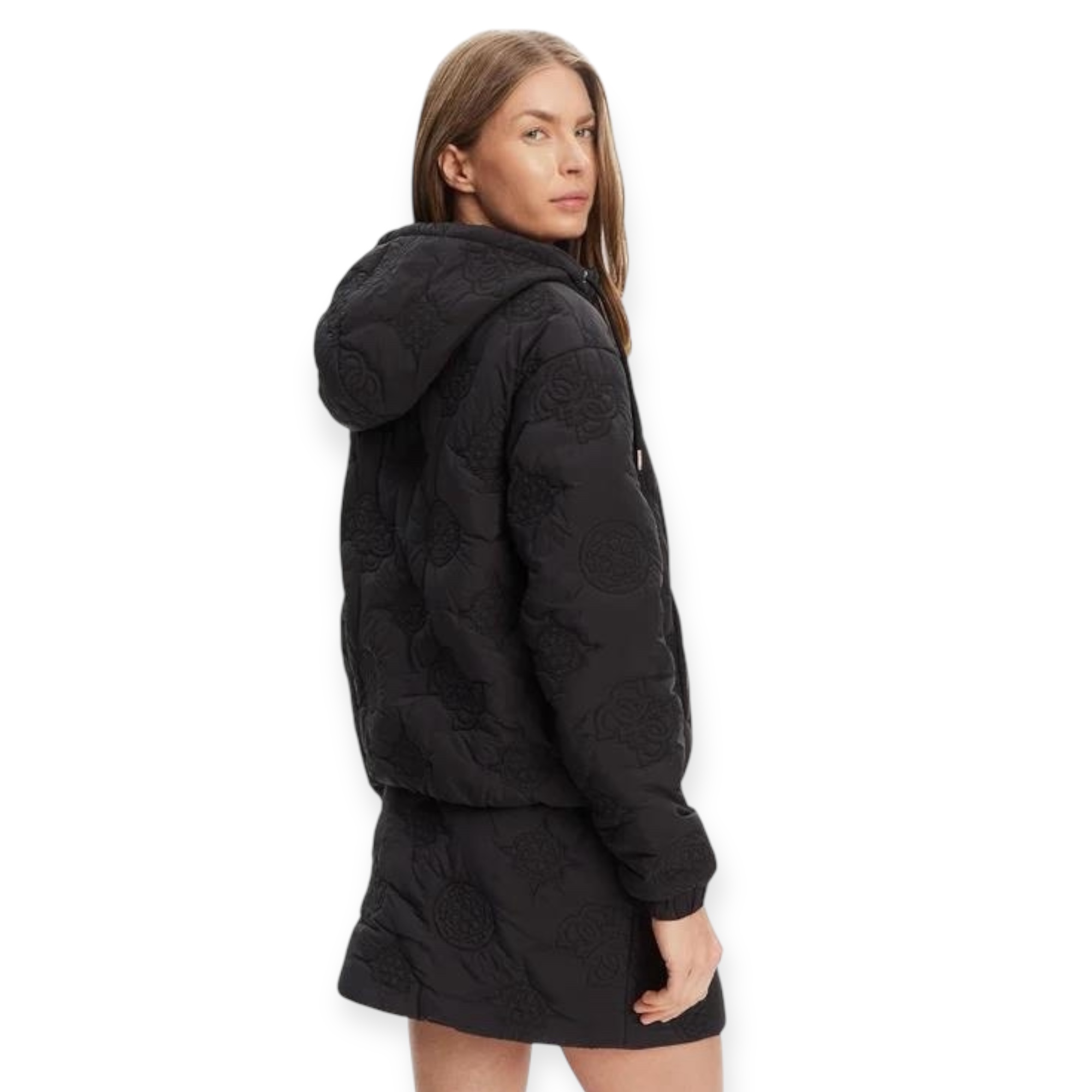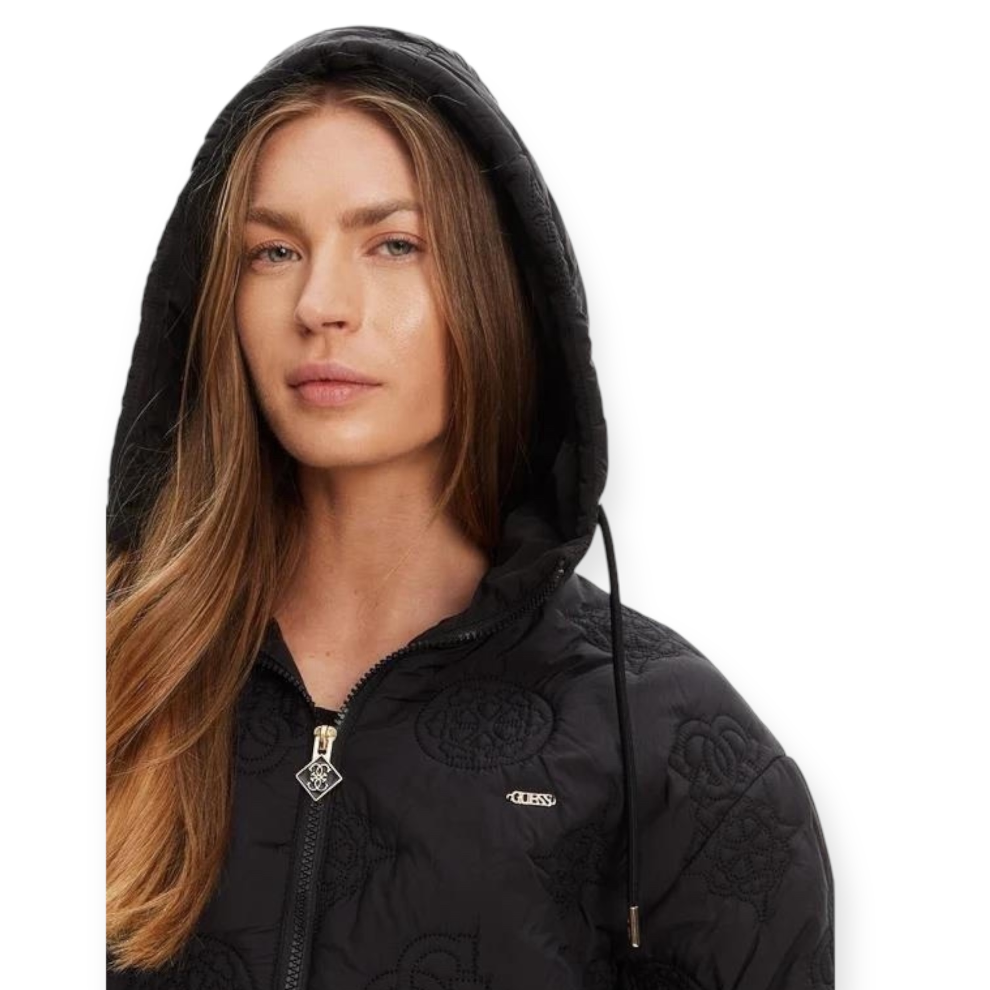 מעיל נשים קצר של guess בצבע שחור, בעיצוב קווילט עם הטבעות לוגו עדינות. כולל כובע עם שרוך, רוכסן קדמי וכיסי צד נוחים. מעניק מראה יוקרתי, נעים ומחמם לחורף.