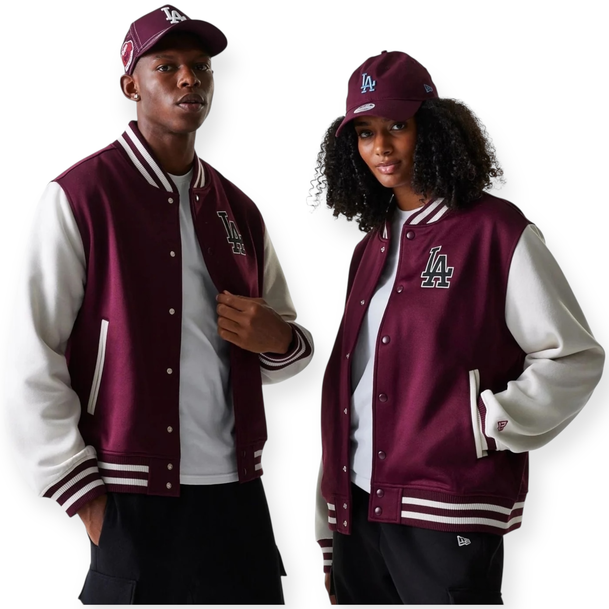 ג’קט בייסבול יוניסקס new era x la dodgers בצבע בורדו עם שרוולים לבנים. עיצוב קולג’ קלאסי עם סגירת כפתורי לחיצה, פסים מנוגדים בצווארון ובשרוולים ולוגו LA רקום בחזה – לוק אורבני עם טוויסט אמריקאי.