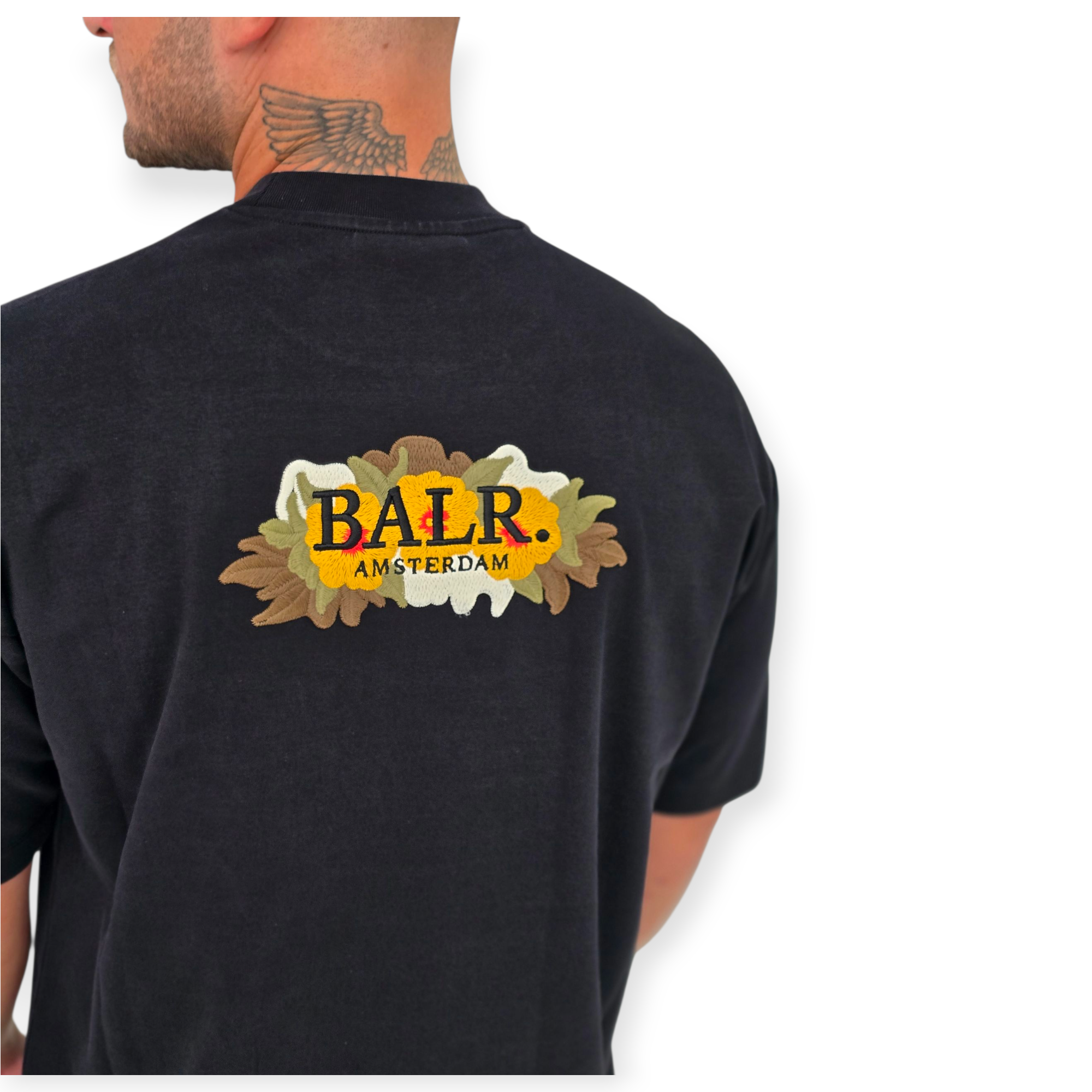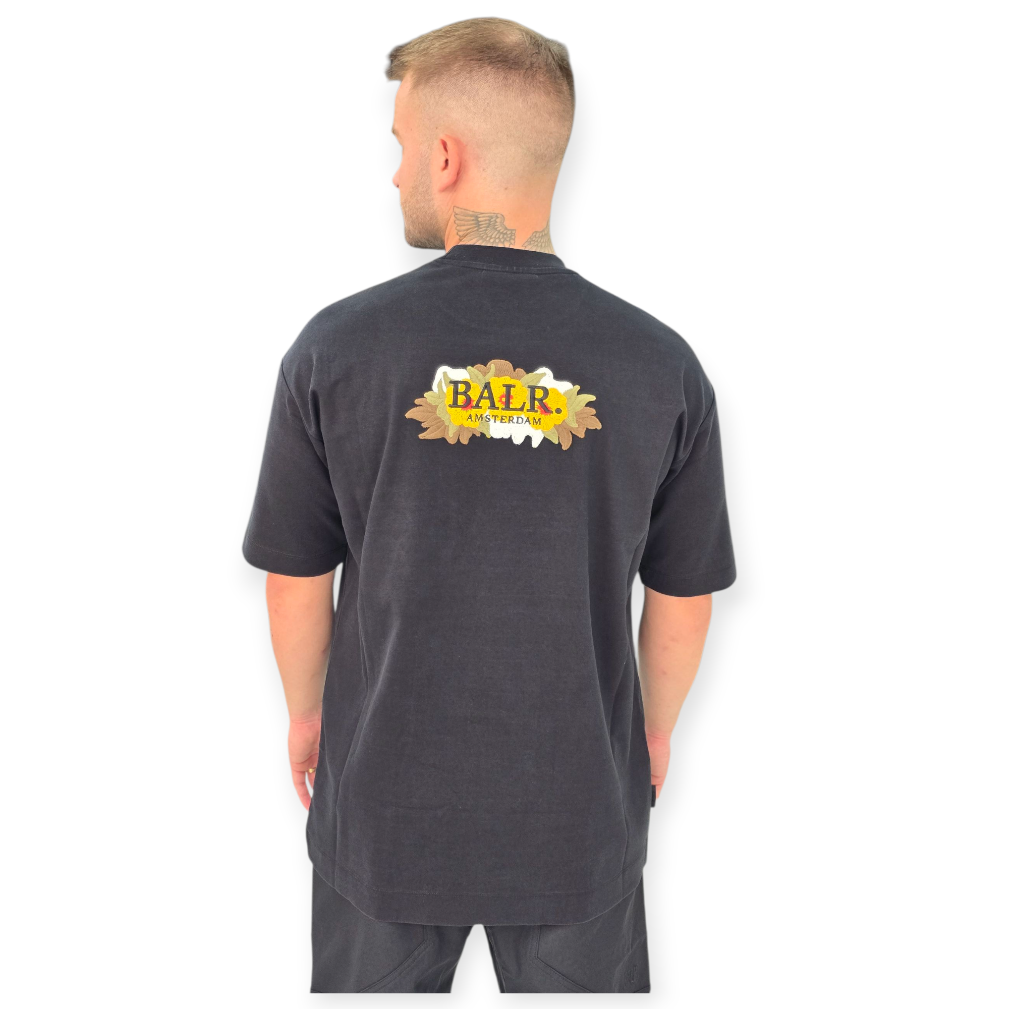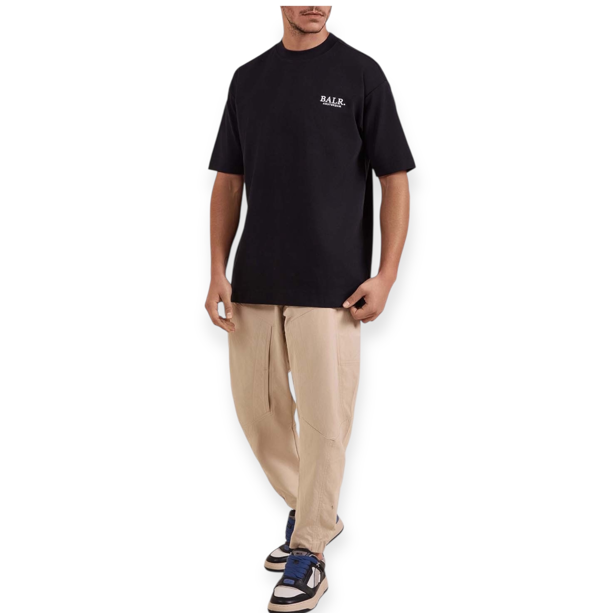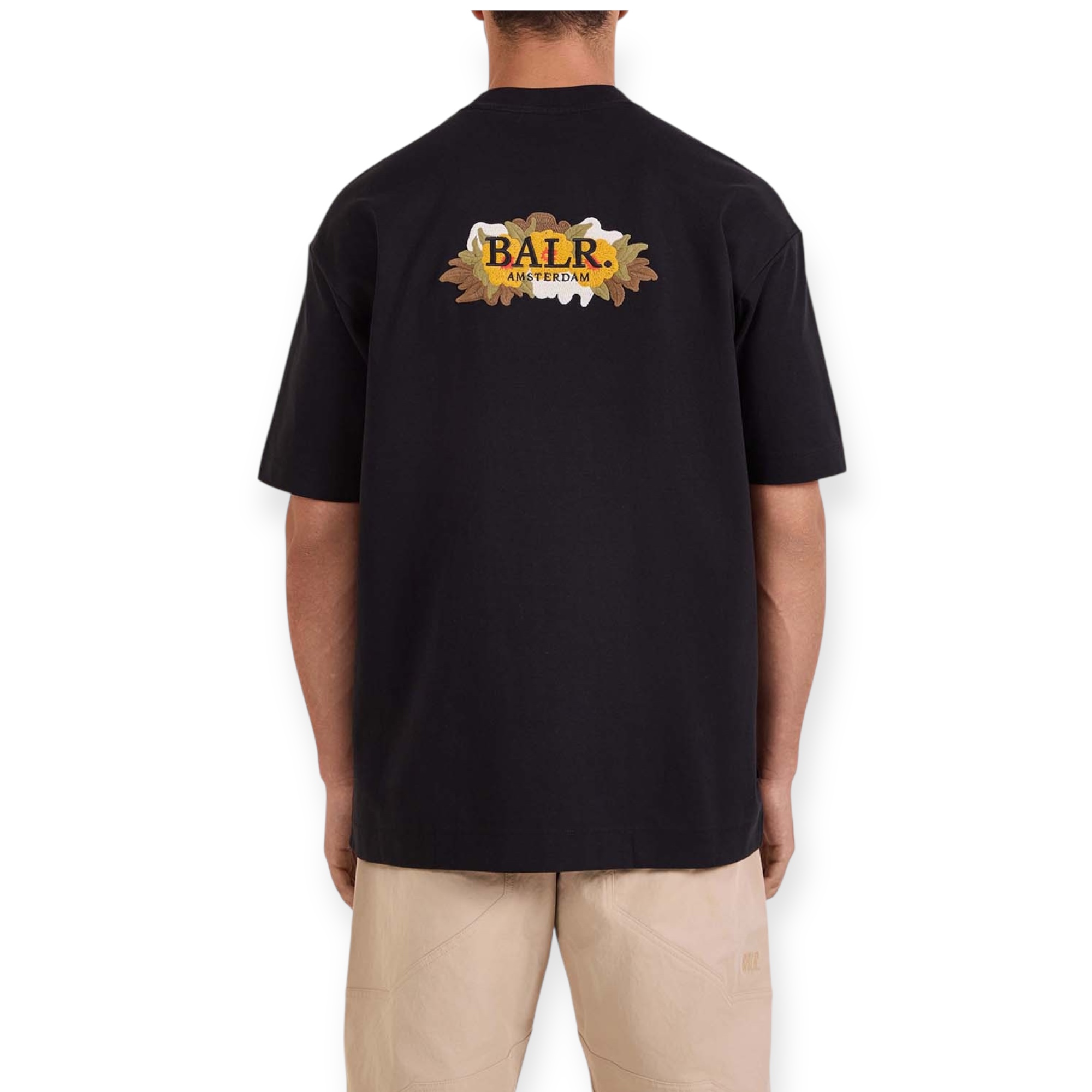 חולצת טי בגזרה משוחררת מבית Balr, עשויה תערובת כותנה בצבע שחור עם דפוס ופאצים מלפנים ואחור.