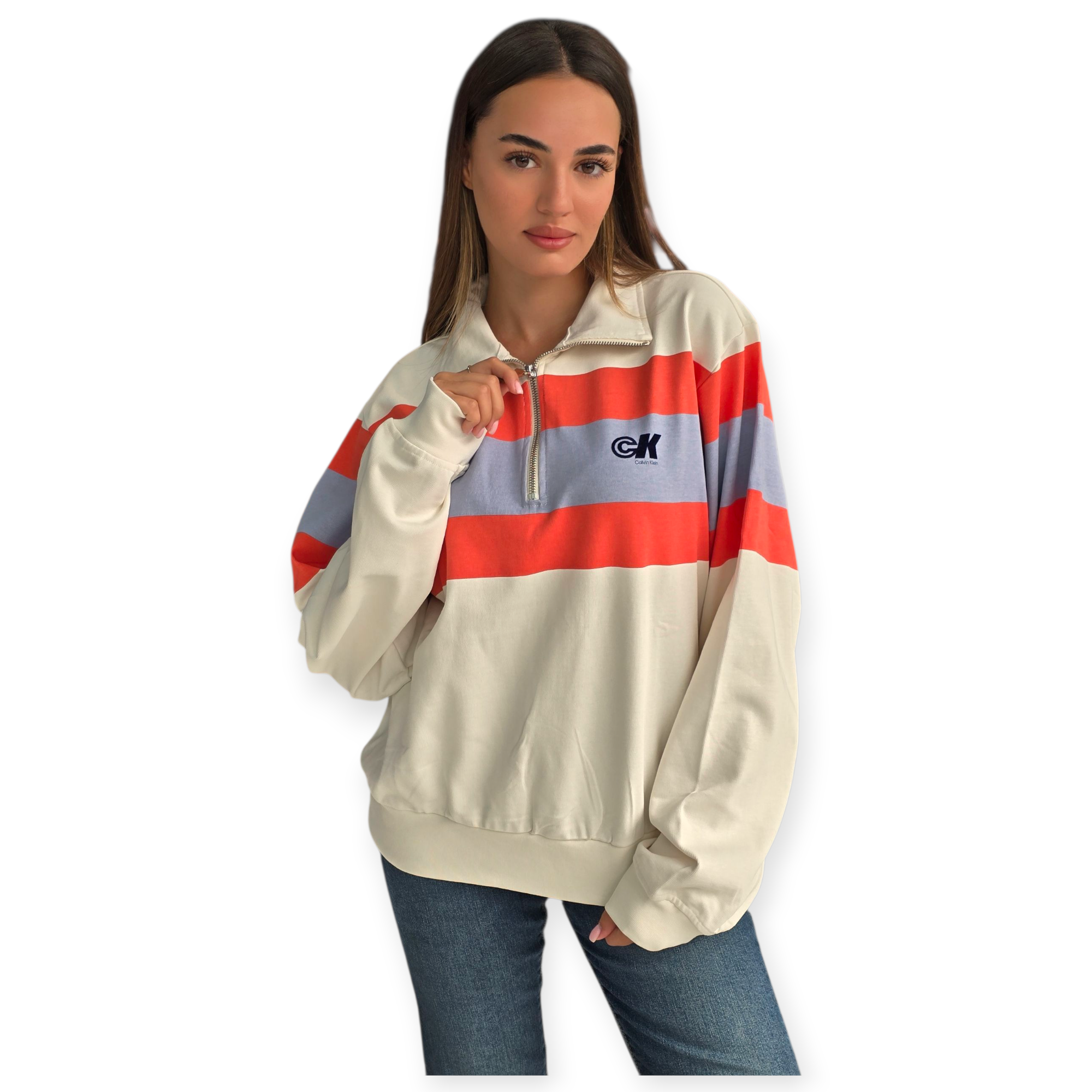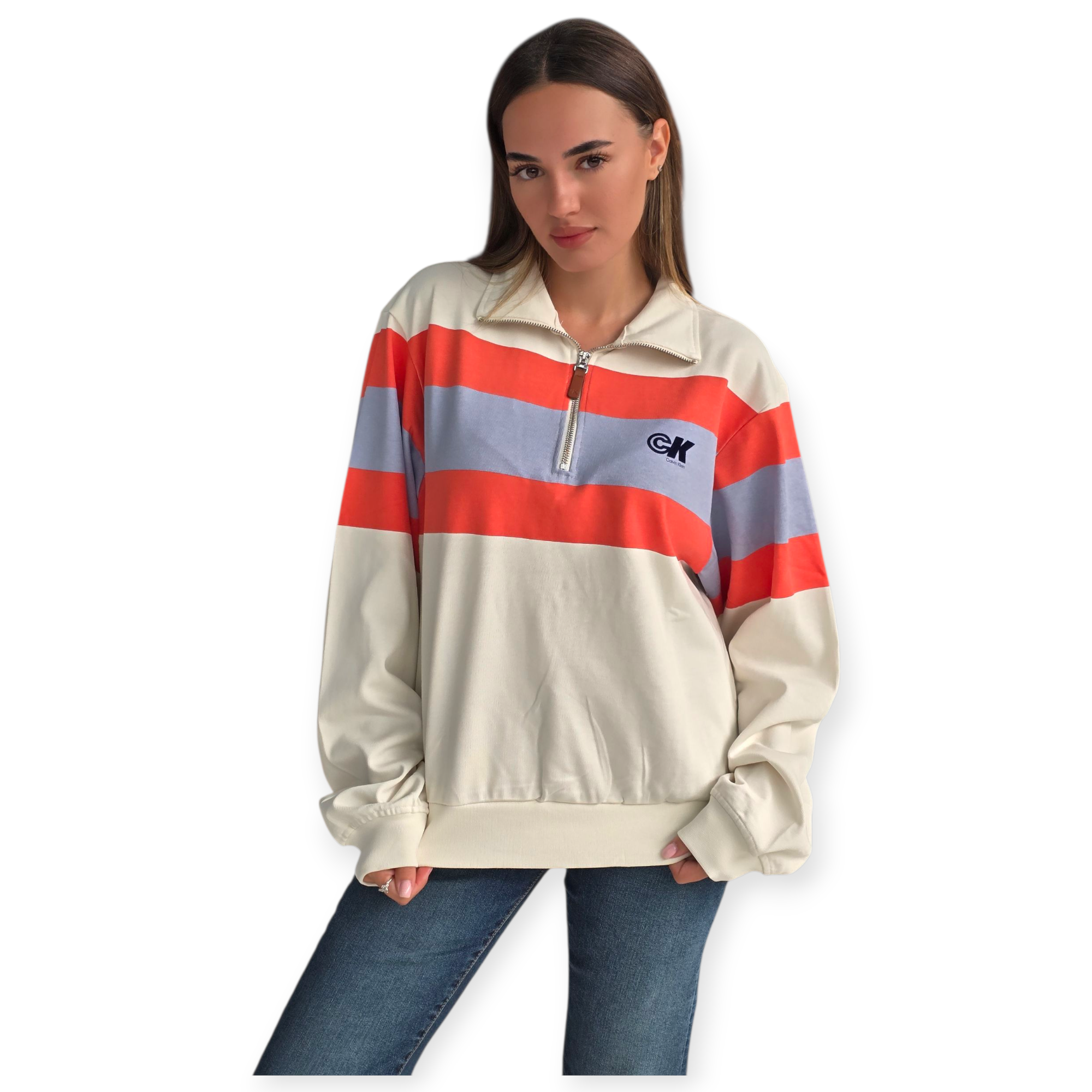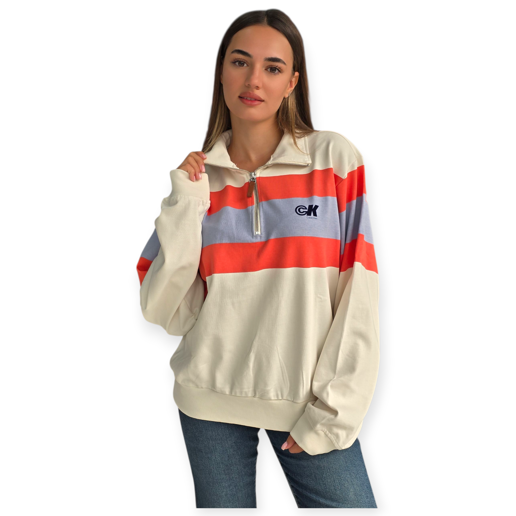 חולצת רוגבי מבית calvin klein עם רוכסן חצי, בצבע שמנת עם פסים רחבים באדום ותכלת. גזרה משוחררת, בד כותנה נעים ולוגו CK קטן בחזה – שילוב מושלם בין ספורטיביות לאופנה יומיומית טרנדית.