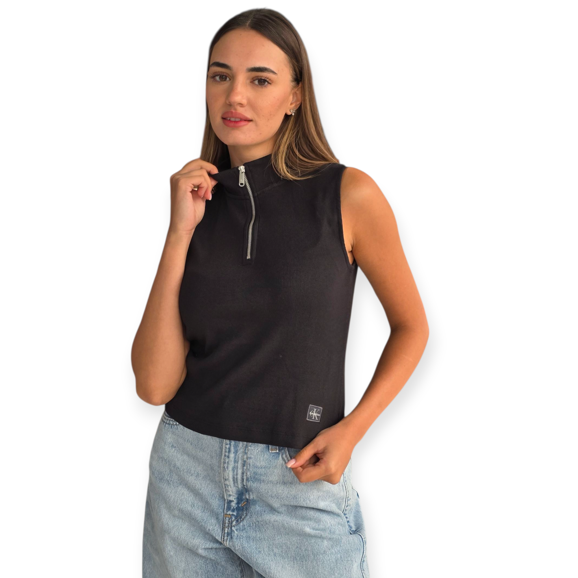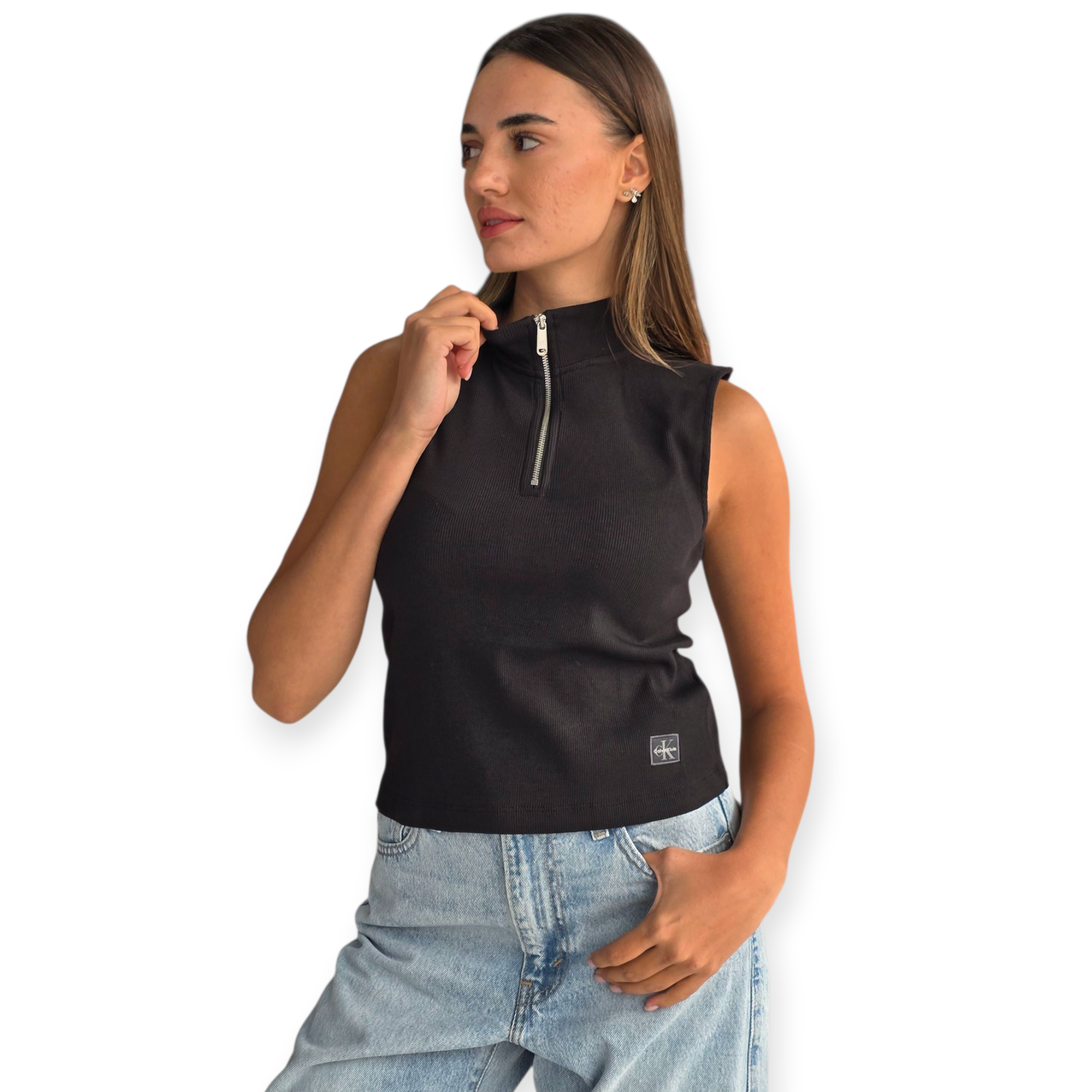 גופיית נשים של calvin klein בגזרת קרופ מחמיאה, עם רוכסן בחזה ולוגו קטן מקדימה. מראה ספורטיבי-שיקי שמתאים לכל אאוטפיט יומיומי