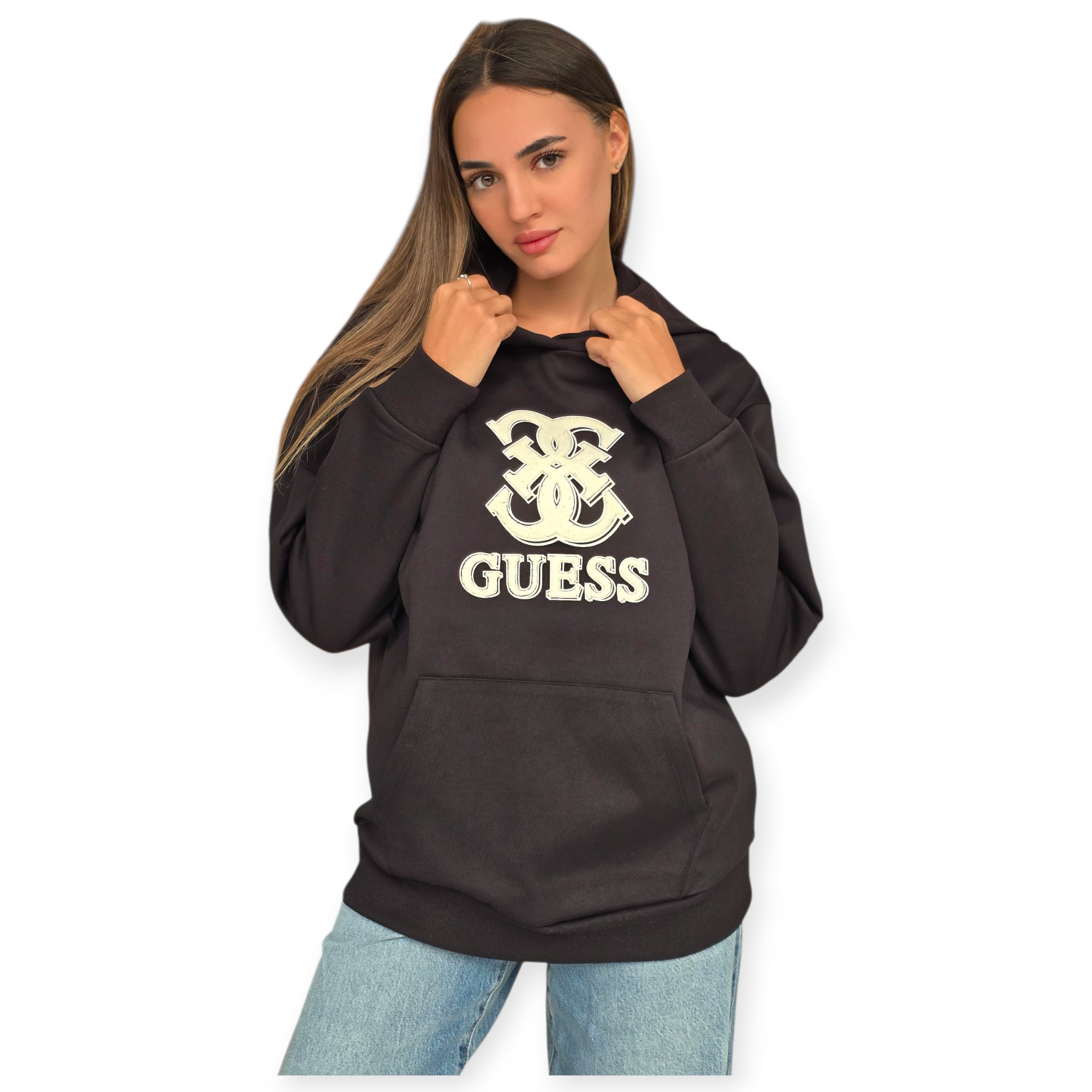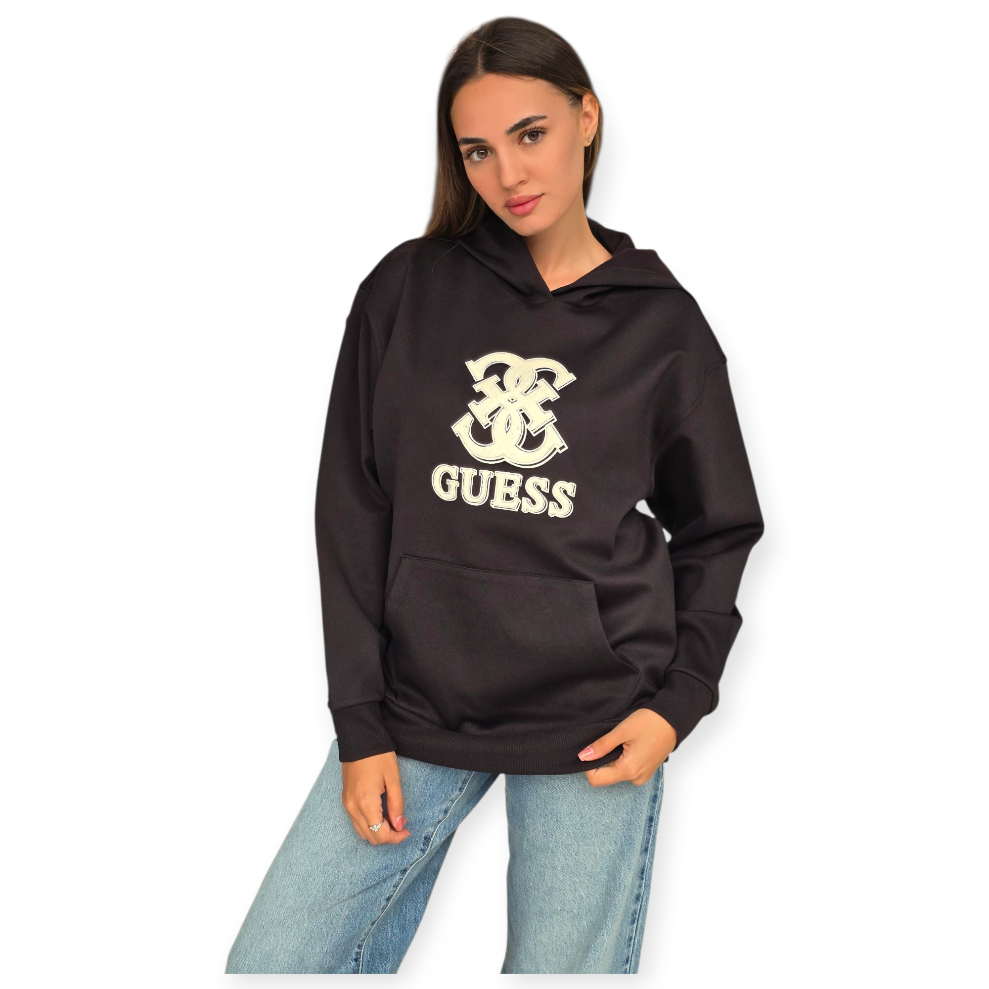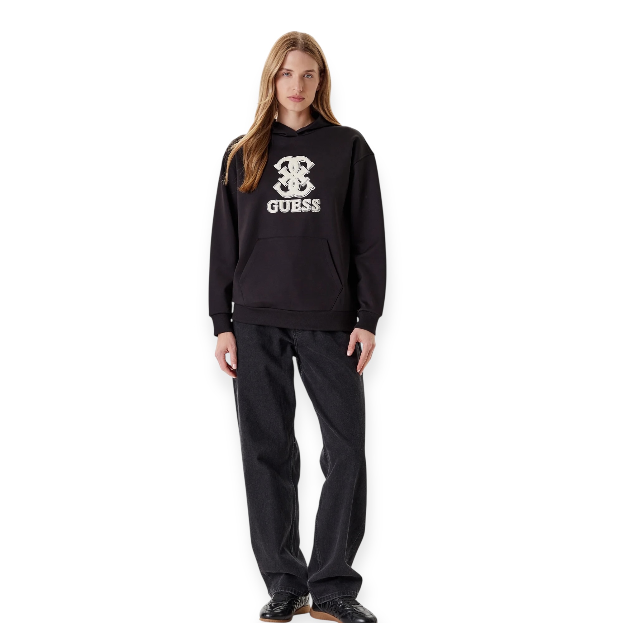 קפוצ’ון לנשים מבית guess בגזרה משוחררת עם כיס קדמי ולוגו רקום בחזית. פריט נוח ומחמם שישדרג כל לוק יומיומי.