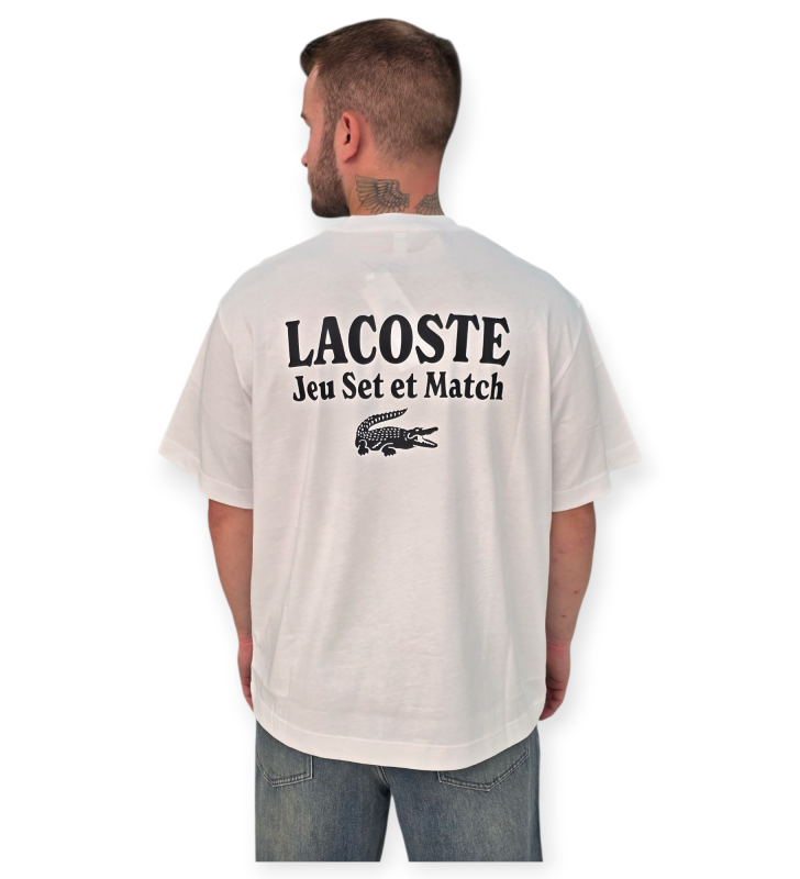 טי שירט לבנה של lacoste עם הדפס גדול בגב – לוק טניס קלאסי ומשוחרר עם טאץ’ אופנתי.