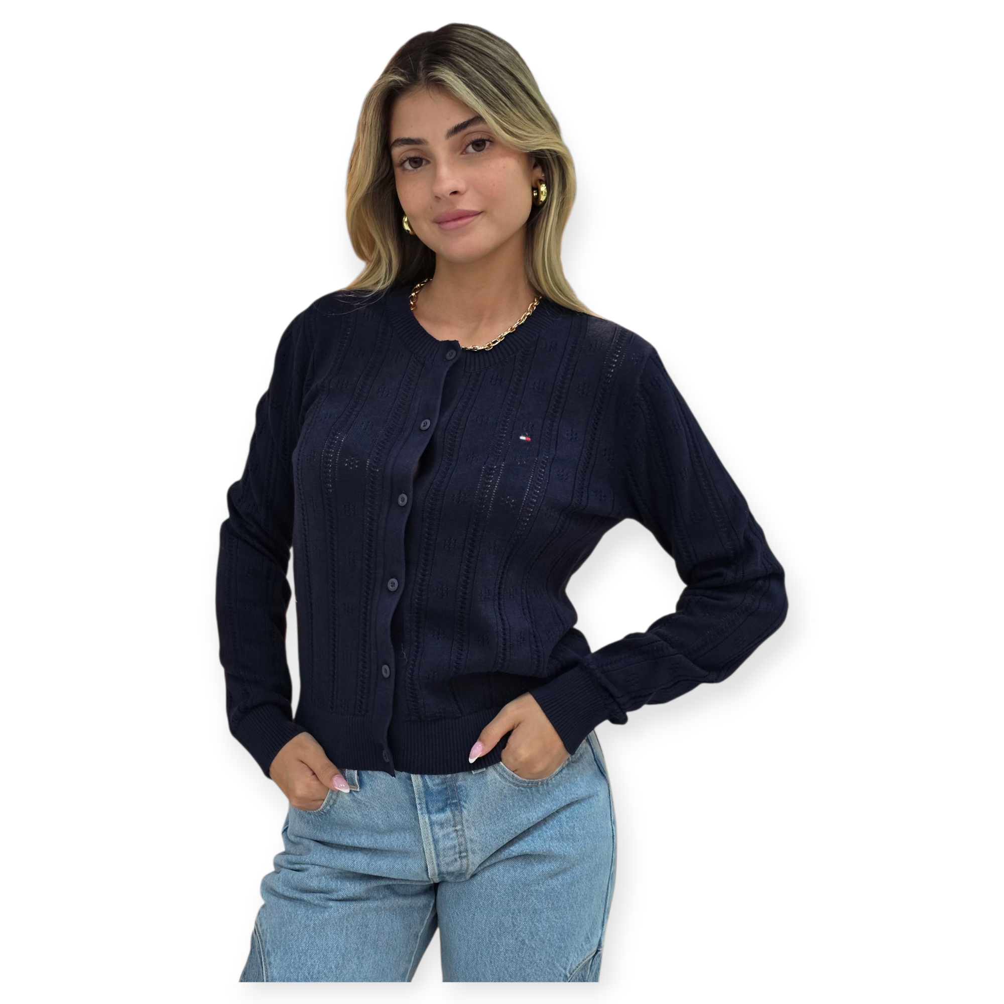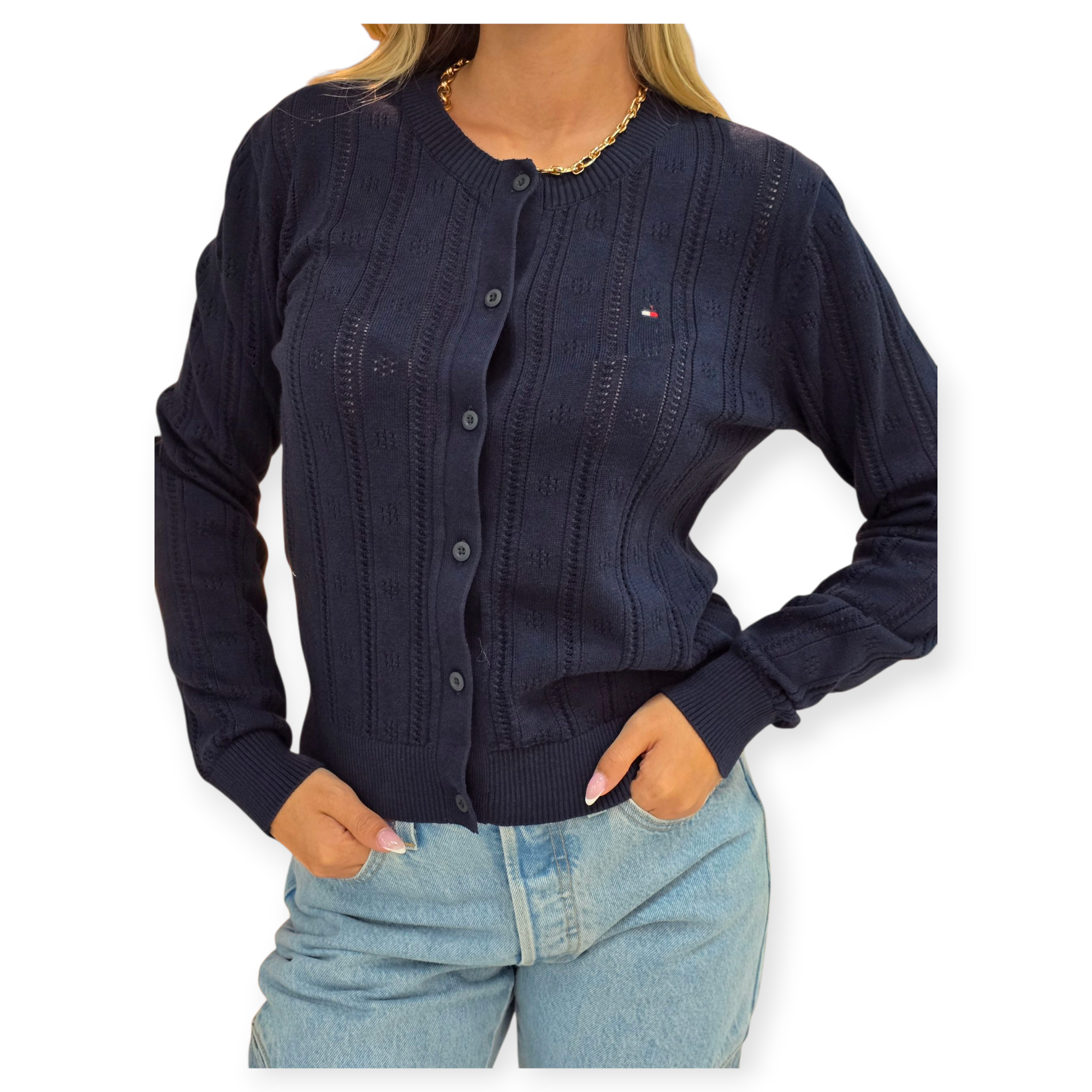 קרדיגן סרוג מבית tommy hilfiger , עם כפתורים קדמיים ולוגו רקום קטן בחזה. גזרה קלאסית ונשית, סריג נעים עם דוגמת טקסטורה עדינה – מושלם לשילוב יומיומי עם ג’ינס או חצאית.