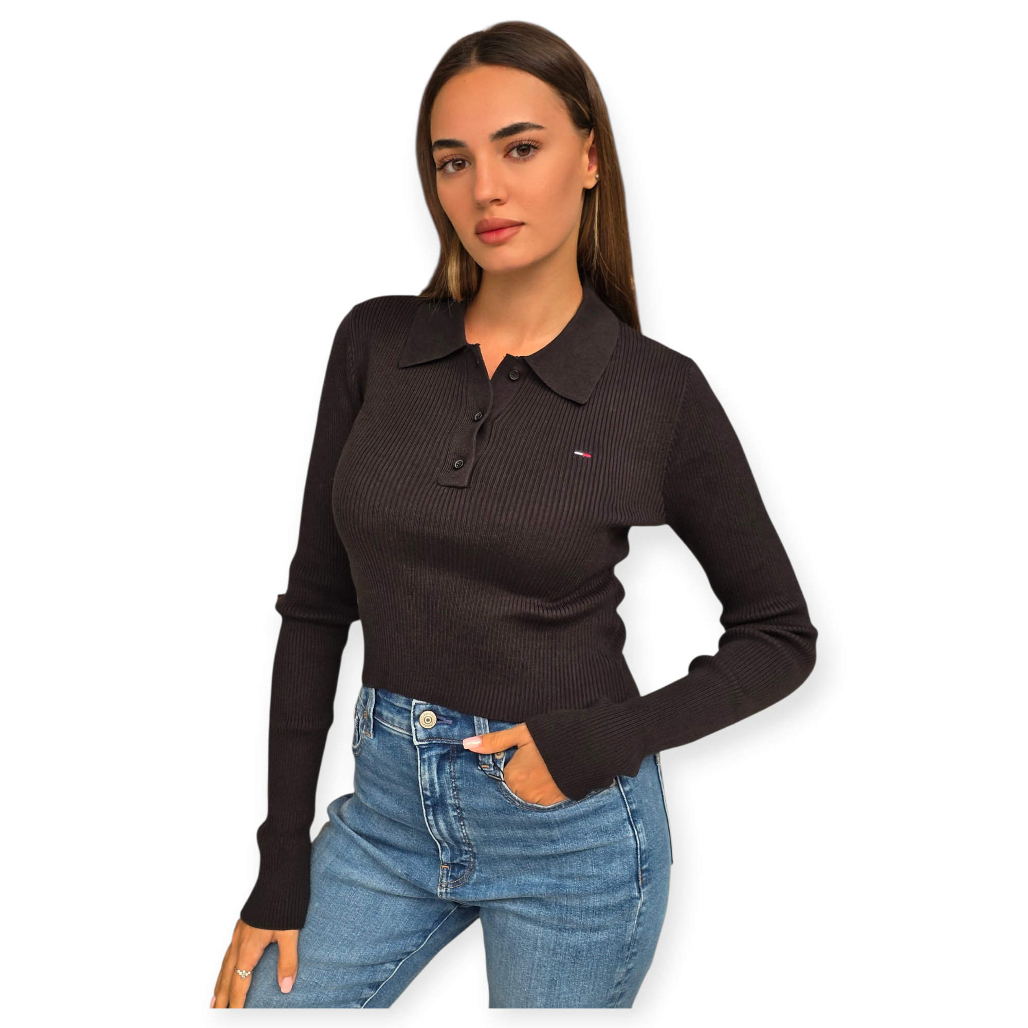 סוודר פיקה ריב מבית tommy hilfiger בגזרת פולו ארוכה עם צווארון וכפתורים, בשחור קלאסי עם לוגו רקום קטן בחזה. שילוב מושלם בין אלגנטיות יומיומית לנוחות, מתאים עם חצאית או ג’ינס לכל עונה.