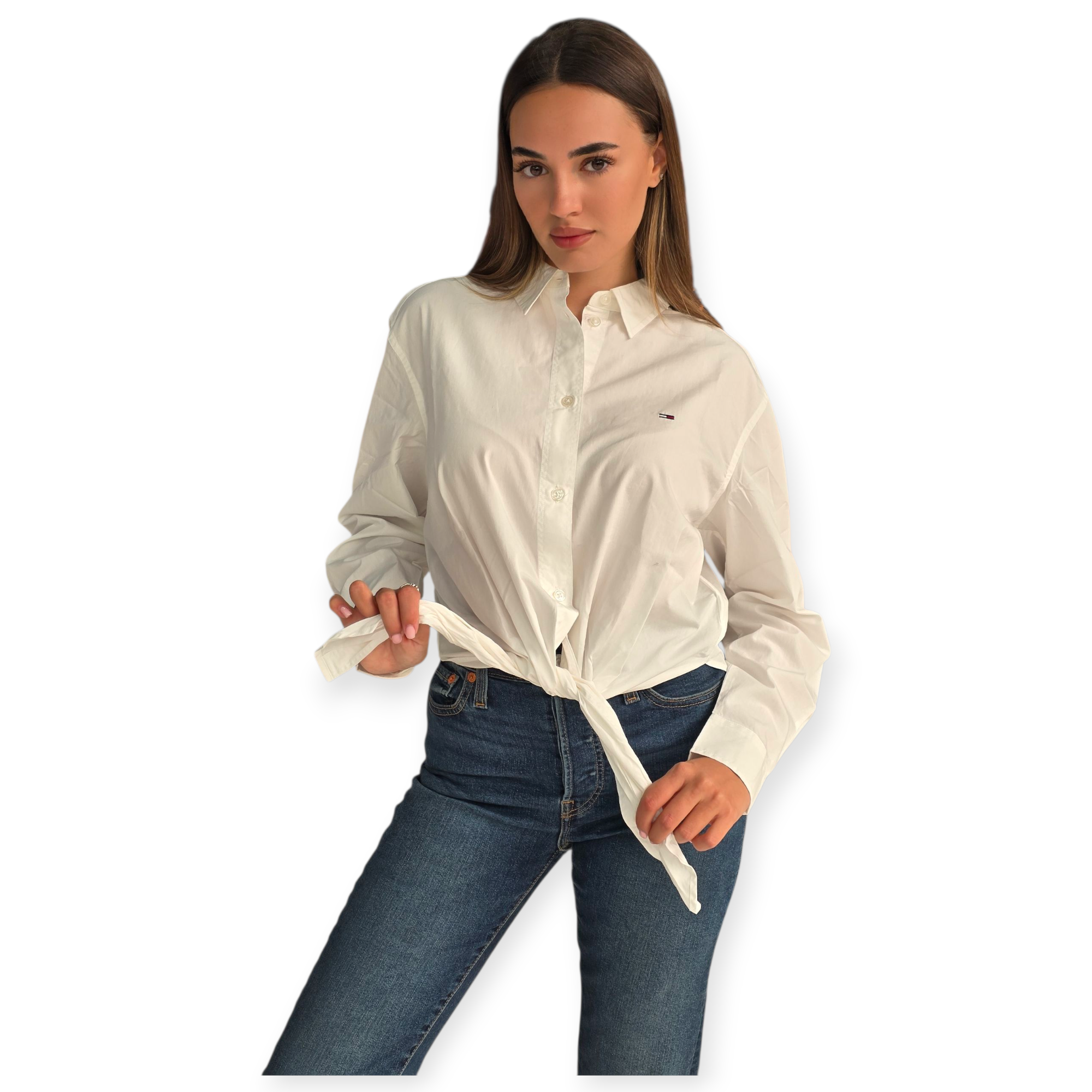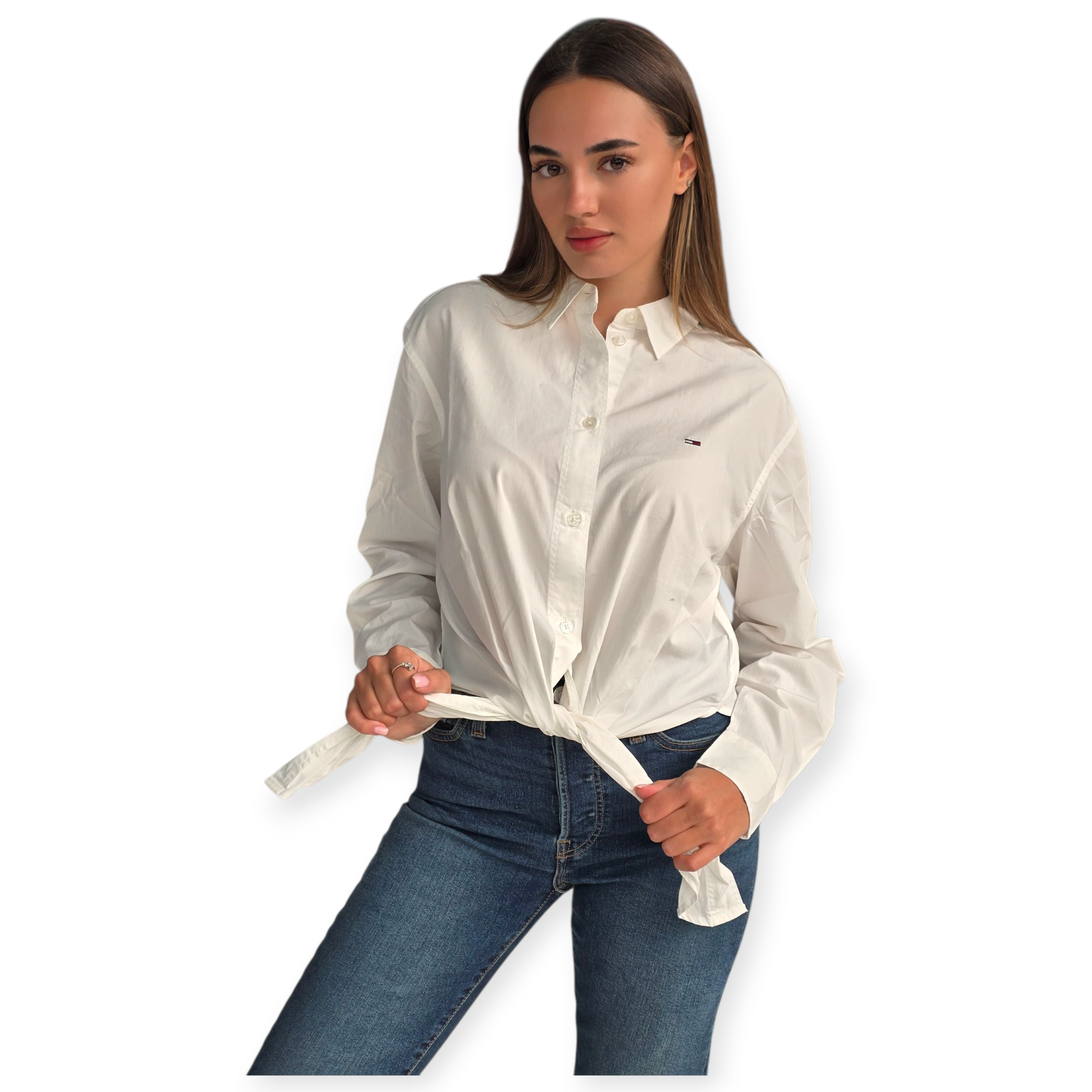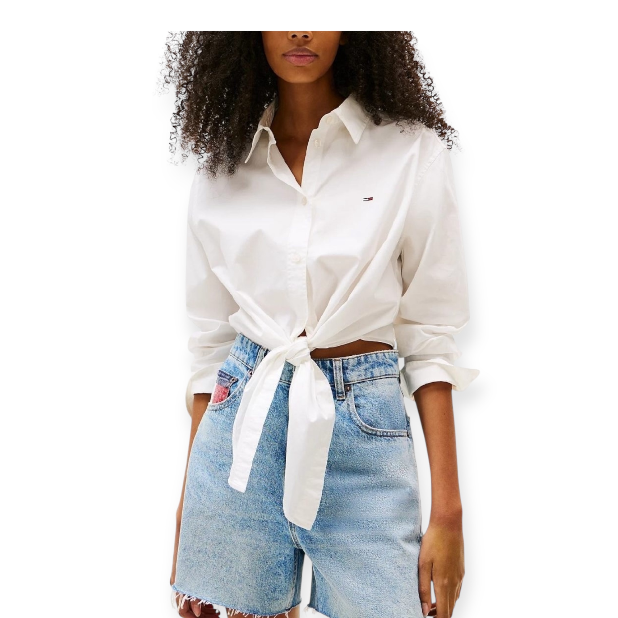 חולצת כפתורים ארוכה מבית tommy jeans בצבע לבן , עם קשירה קדמית שמוסיפה טאץ’ קליל ומעודכן. גזרה קלאסית עם צווארון חד ולוגו קטן בחזה – מושלמת לשילוב עם ג’ינס או חצאית לסטייל יום־יומי טרנדי.