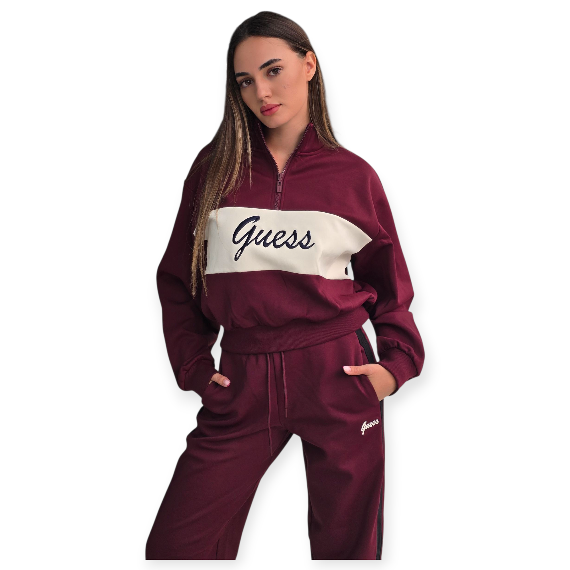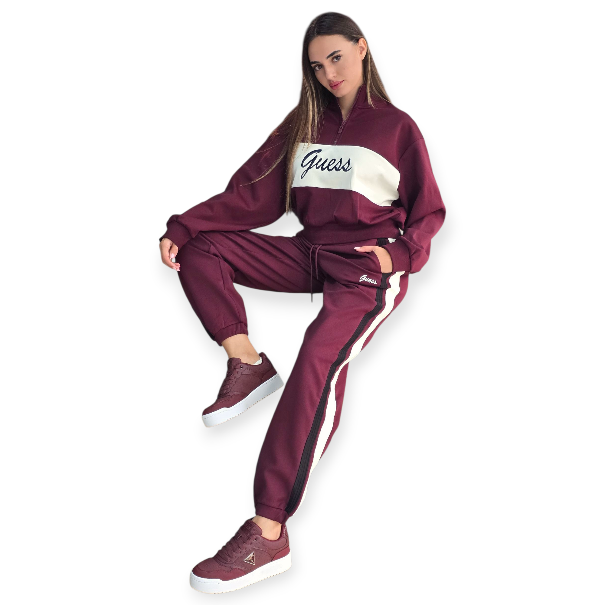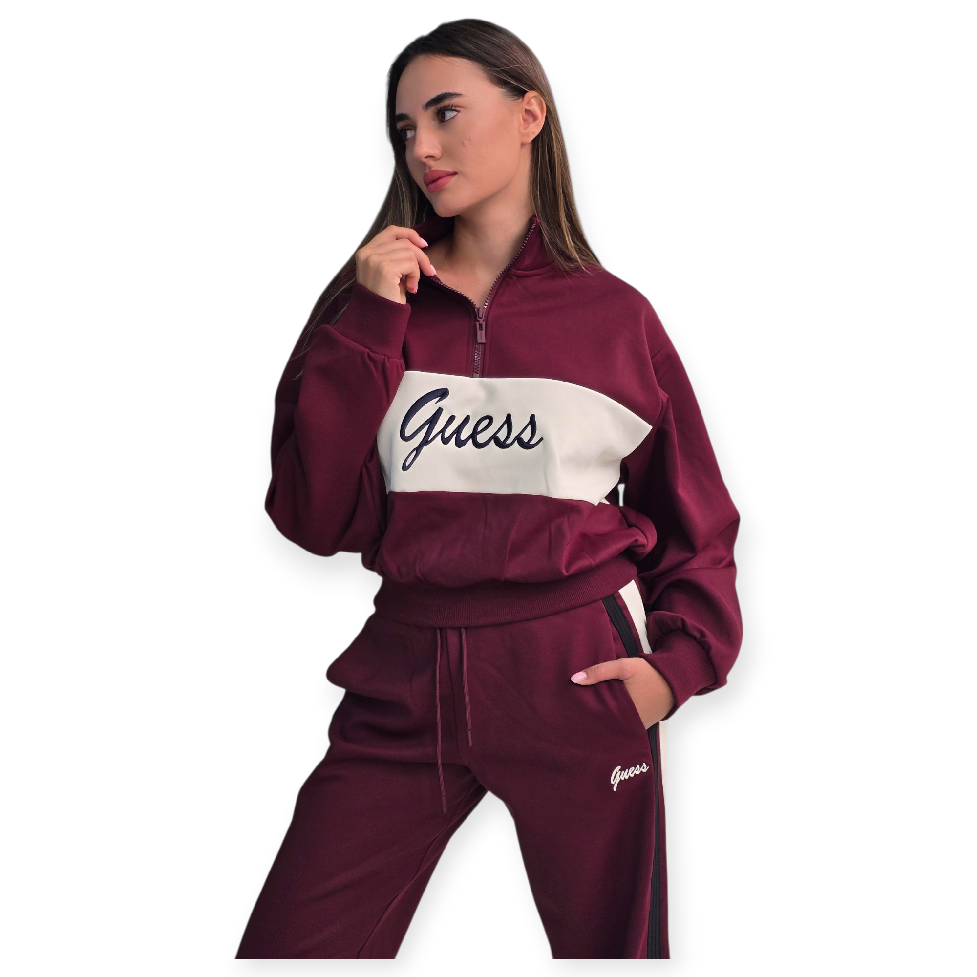 חליפת טרנינג נשים של guess משלבת נוחות וסטייל ספורטיבי. העליונית כוללת רוכסן קצר וצווארון גבוה, והמכנס בגזרת ג׳וגר עם שרוך קשירה ופסים צידיים למראה מחמיא ומעודכן. מושלם ללוק יומיומי עם טאץ’ אלגנטי.הרכב בד פוליאסטר 86% ויסקוזה 8% ספנדקס 6%