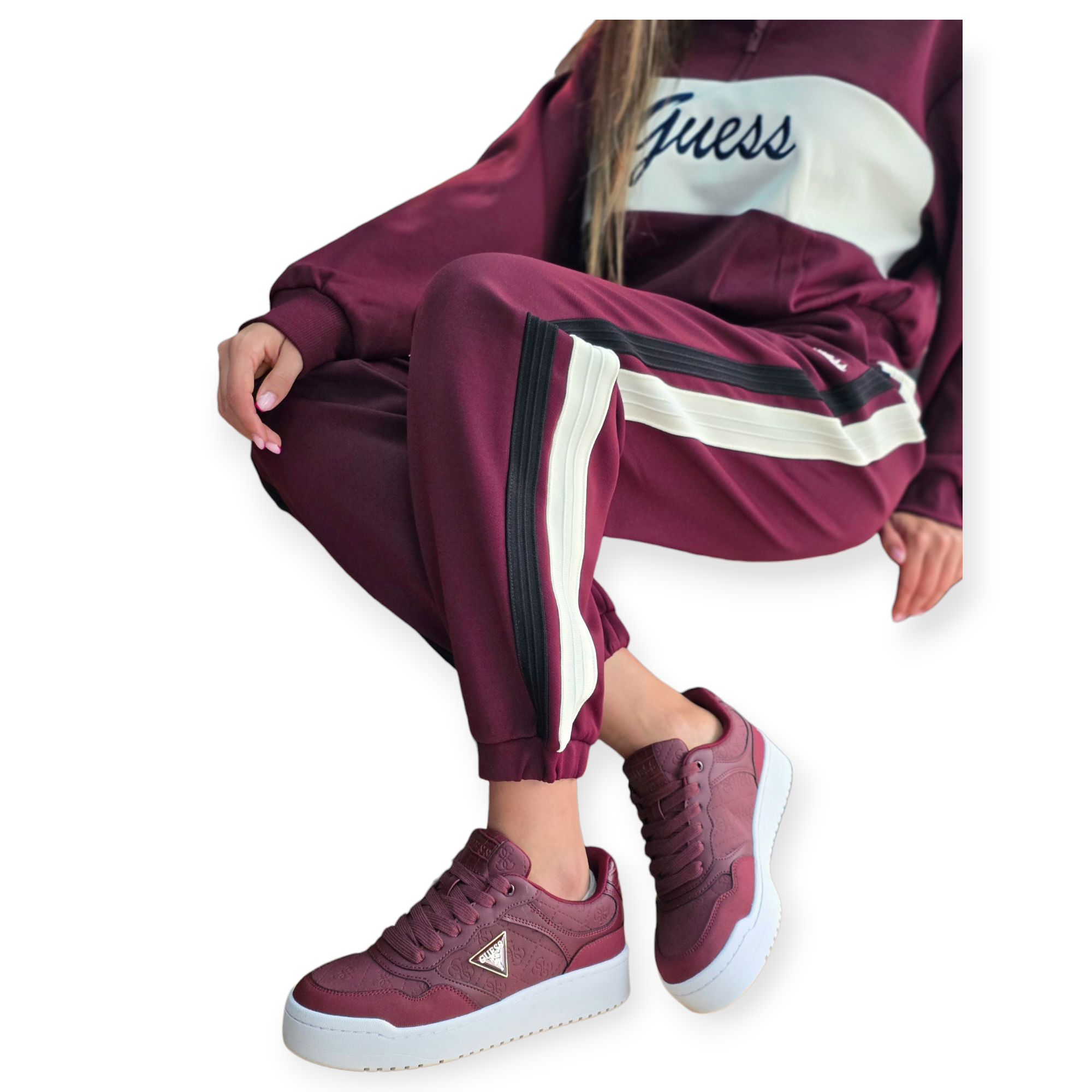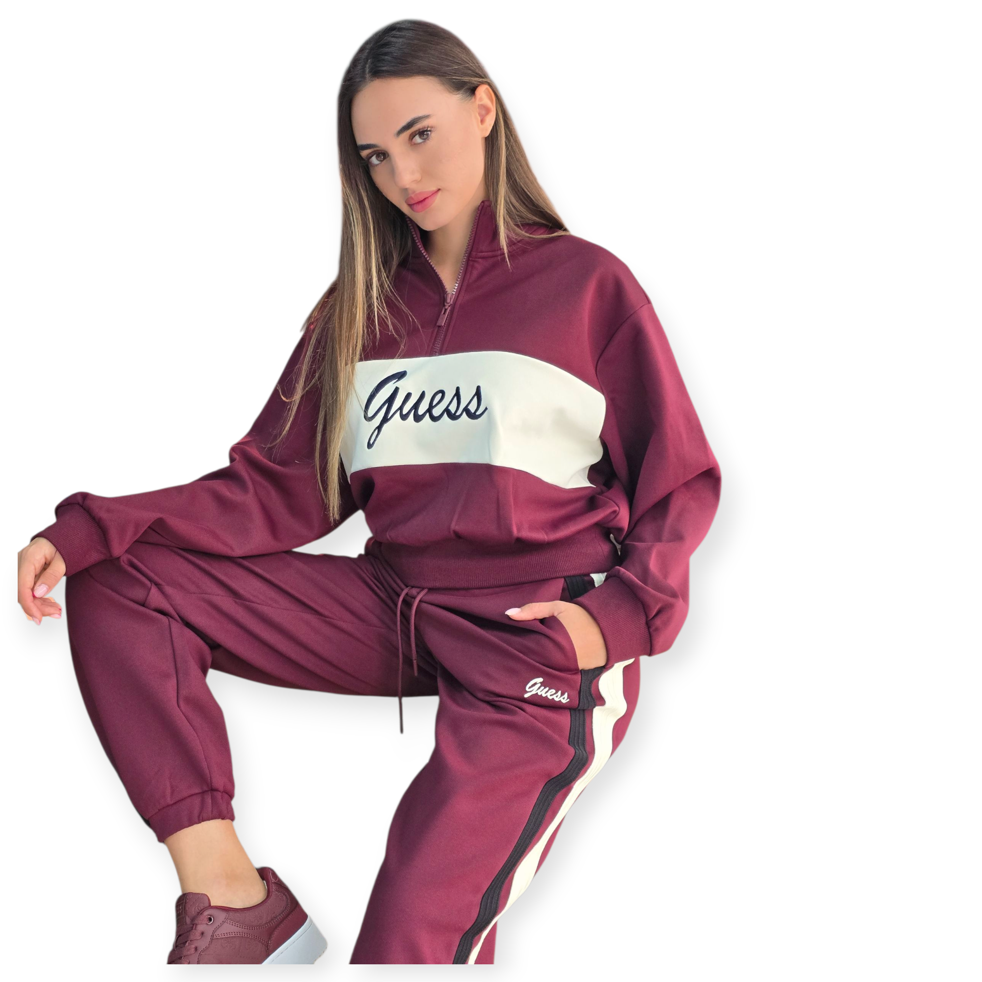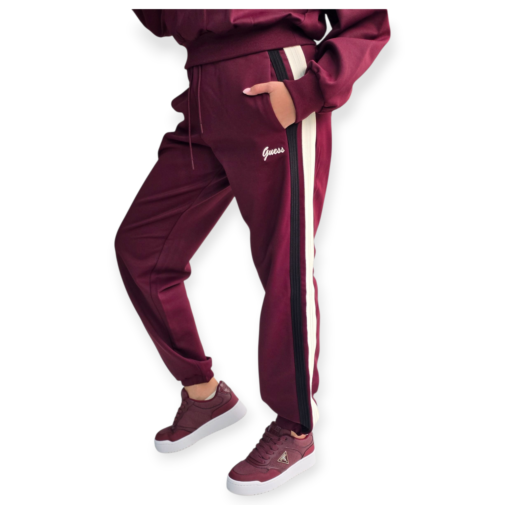 חליפת טרנינג נשים של guess משלבת נוחות וסטייל ספורטיבי. העליונית כוללת רוכסן קצר וצווארון גבוה, והמכנס בגזרת ג׳וגר עם שרוך קשירה ופסים צידיים למראה מחמיא ומעודכן. מושלם ללוק יומיומי עם טאץ’ אלגנטי.הרכב בד פוליאסטר 86% ויסקוזה 8% ספנדקס 6%