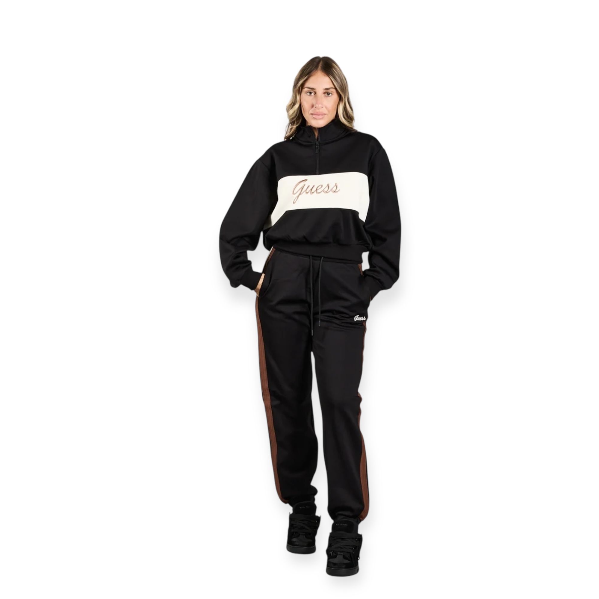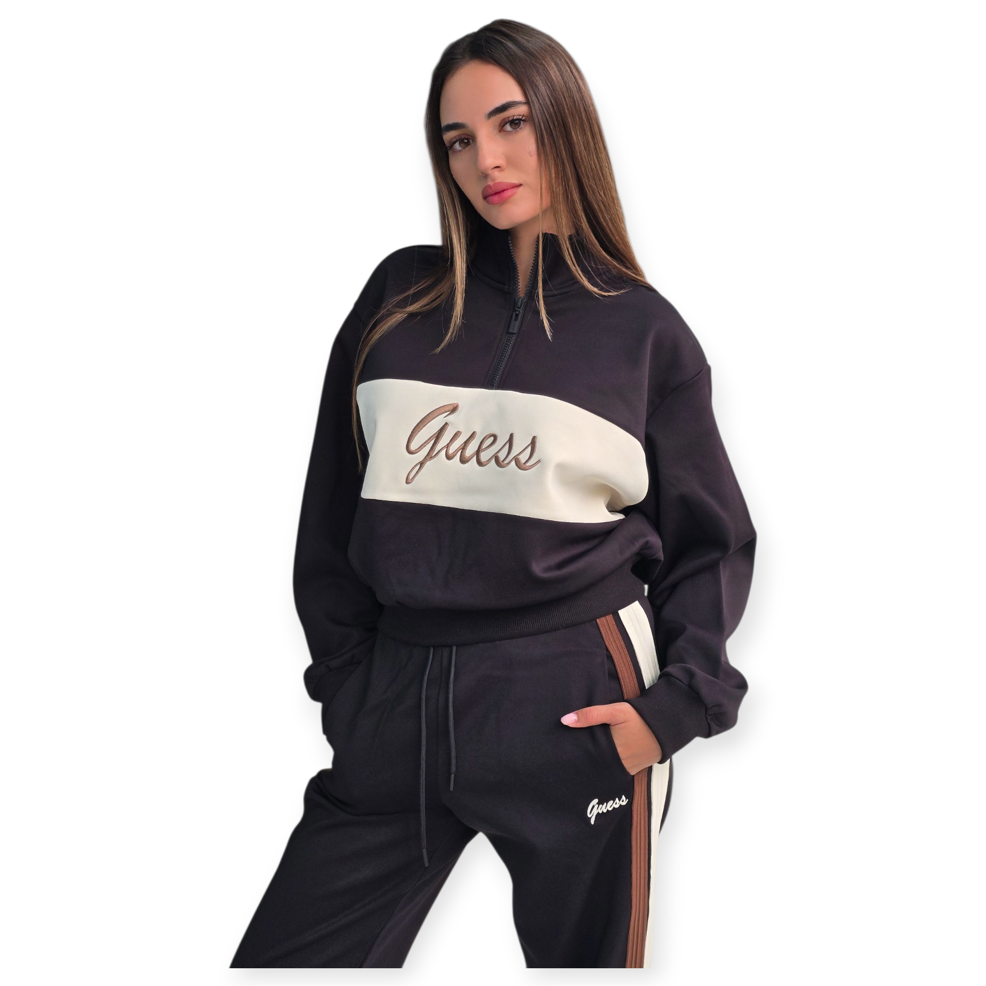 חליפת טרנינג נשים של guess משלבת נוחות וסטייל ספורטיבי. העליונית כוללת רוכסן קצר וצווארון גבוה, והמכנס בגזרת ג׳וגר עם שרוך קשירה ופסים צידיים למראה מחמיא ומעודכן. מושלם ללוק יומיומי עם טאץ’ אלגנטי.הרכב בד פוליאסטר 86% ויסקוזה 8% ספנדקס 6%