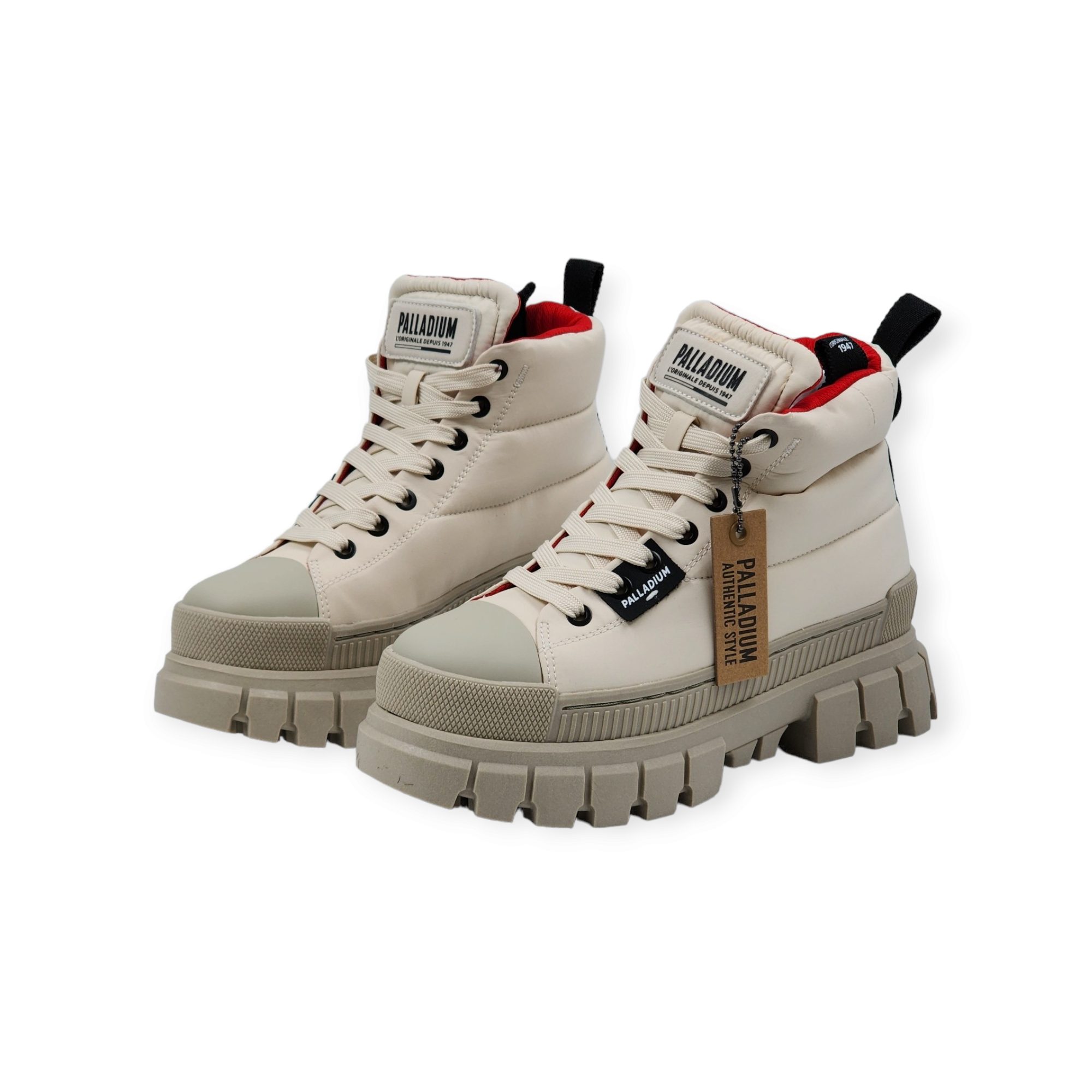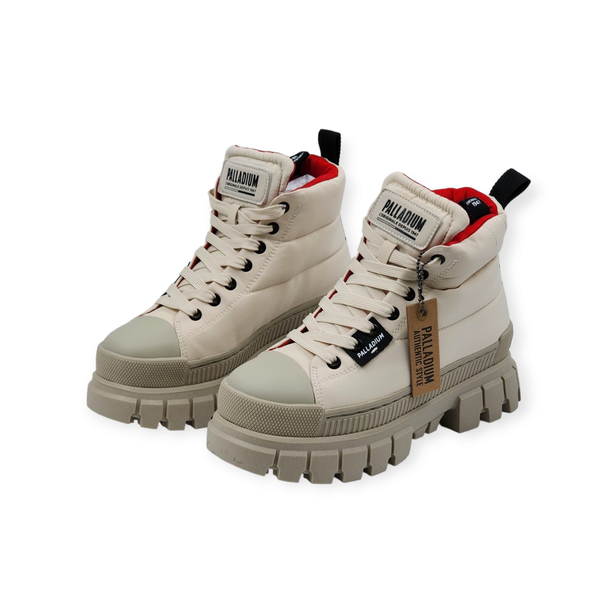 פעילי תנועות נוער חלוציות? קיבוצניקים על טרקטורים? מתבגרי ניינטיז? אלה רק חלק מהאסוציאציות המתלוות למילה פלדיום. אבל הסיפור של המותג PALLADIUM מתחיל הרבה קודם ובמקום אחר לגמרי. החברה נוסדה ב-1920 בצרפת כמפעל ייצור צמיגים למטוסים. אחרי מלחמת העולם השנייה הדרישה לצמיגים פחתה משמעותית ובפלדיום החליטו להיוולד מחדש כחברת נעליים שעושה שימוש בחומרים בהם היא מתמחה – קנבס וגומי. ב-1947 נולד דגם הפמפה המפורסם, שהנוחות והעמידות שלו עמדו בתנאי שטח קשים וגרמו לצבא צרפת לגייס אותו לשורותיו. אבל ההצלחה של נעלי PALLADIUM לא נשארה בגבולות צרפת והפופולאריות של הנעליים חצתה יבשות ותרבויות. לאחר גלי הצלחה נוספים בשנות ה-70 ה-90 נעלמו הנעליים מפני השטח האופנתי. בשנים האחרונות זוכות הפלדיום לרנסנס עם שיאי פופולאריות חדשים, זאת לאחר שהמותג נרכש על ידי יזם הולנדי שהשיב לו את הצבע ללחיים (ולקנבס). למרות שהעיצוב כמעט ולא השתנה, הסגנון והאיכות ששירתו בעבר לוחמי קומנדו קיבלו רלוונטיות מחודשת בסביבה האורבנית, עם קולקציות לנשים, גברים וילדים, צבעוניות חדשה ומשמחת.