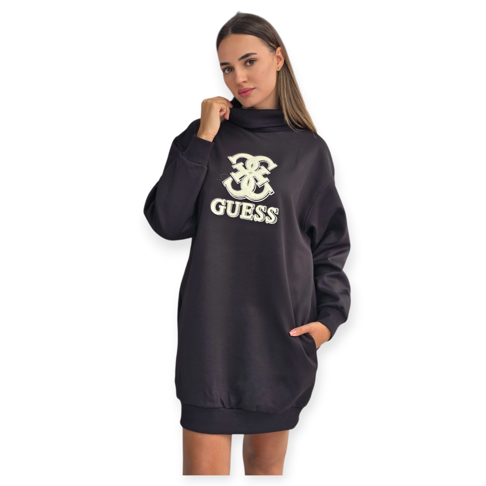 שמלת קז’ואל מבית guess עם גזרה משוחררת, צווארון גבוה ולוגו רקום בחזית. שילוב מושלם בין נוחות לסטייל יומיומי.