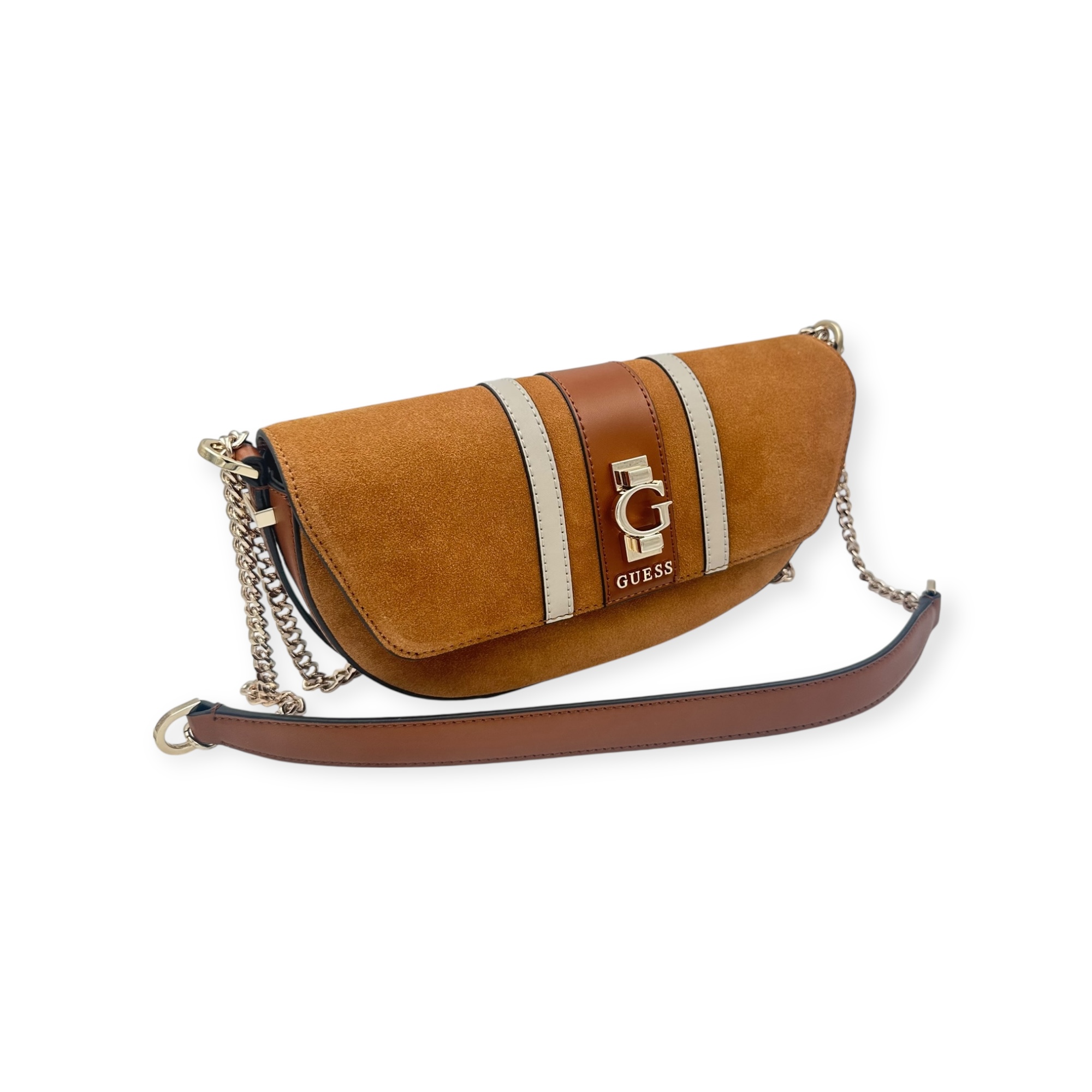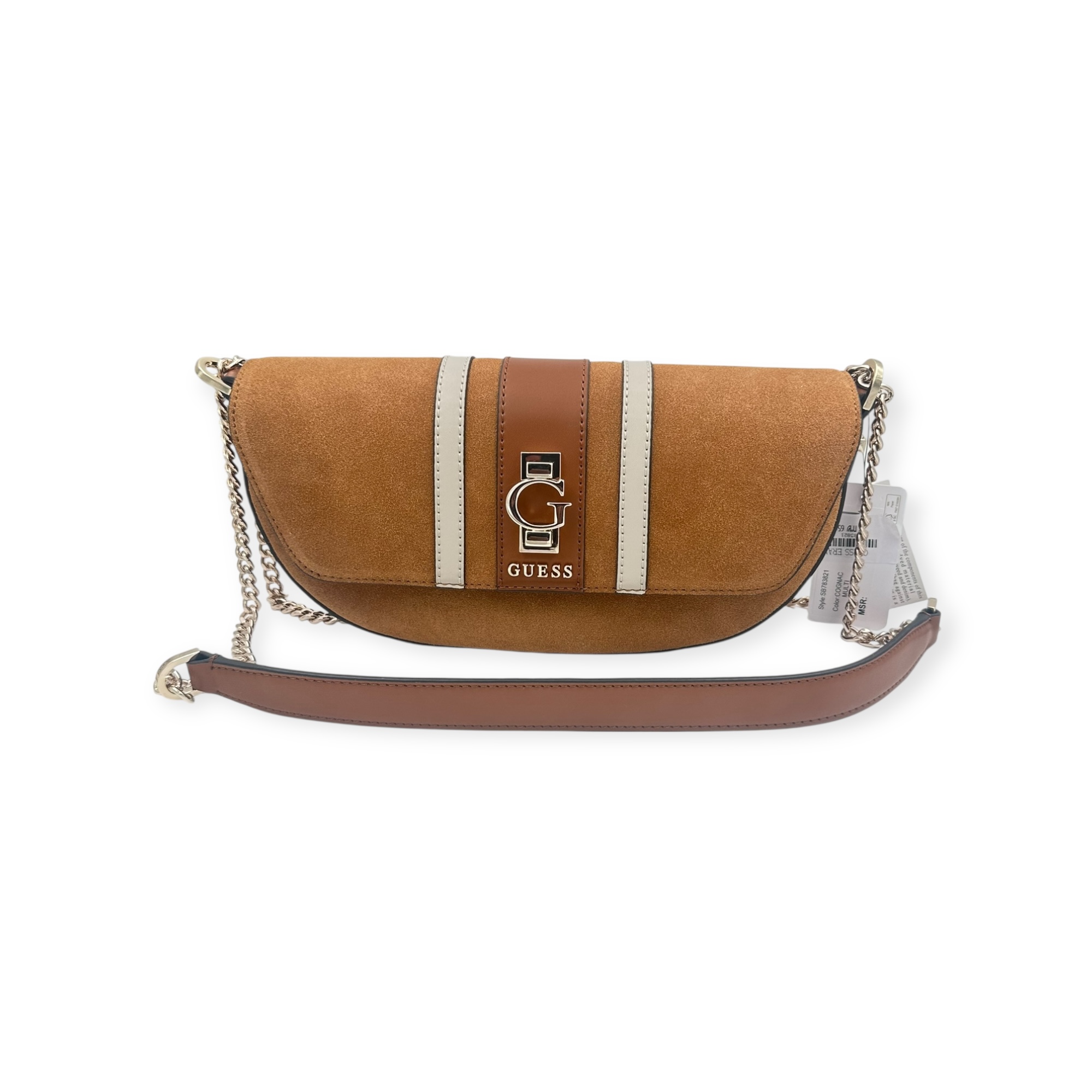 תיק צד נשי ומדויק מבית guess, בעיצוב קלאץ’ מעוגל עם רצועה ארוכה מתכווננת ולוגו מודגש על המכסה. מושלם לשדרוג כל לוק – מיום שגרתי ועד יציאה בערב.