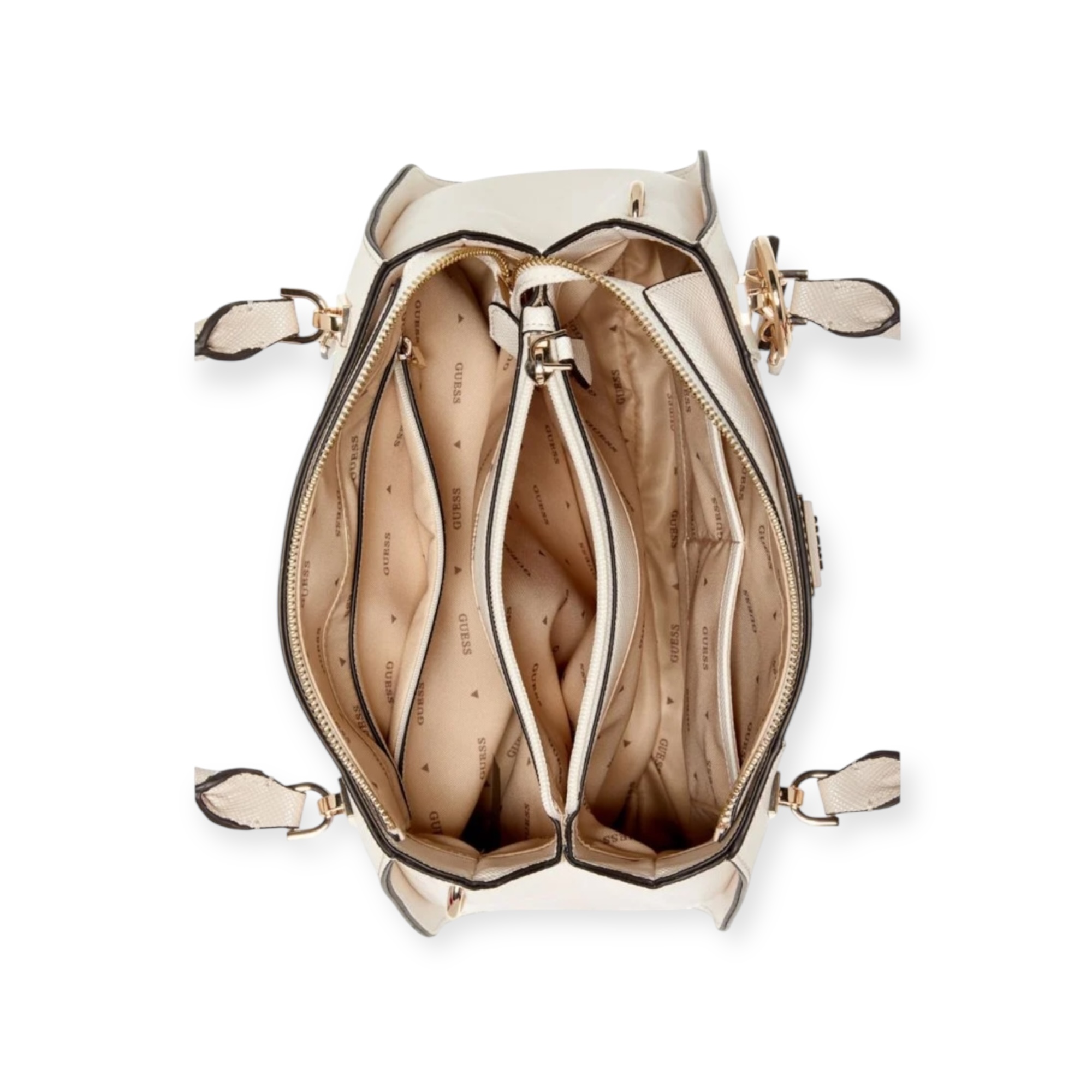 תיק guess מראה יוקרתי עם הדפס לוגו ממותג, תליונים מוזהבים ורצועות כתף דקות ונוחות. חלוקה פנימית חכמה עם שלושה תאים גדולים, כולל תא עם רוכסן – מושלם ליום עמוס שדורש סדר וסטייל.