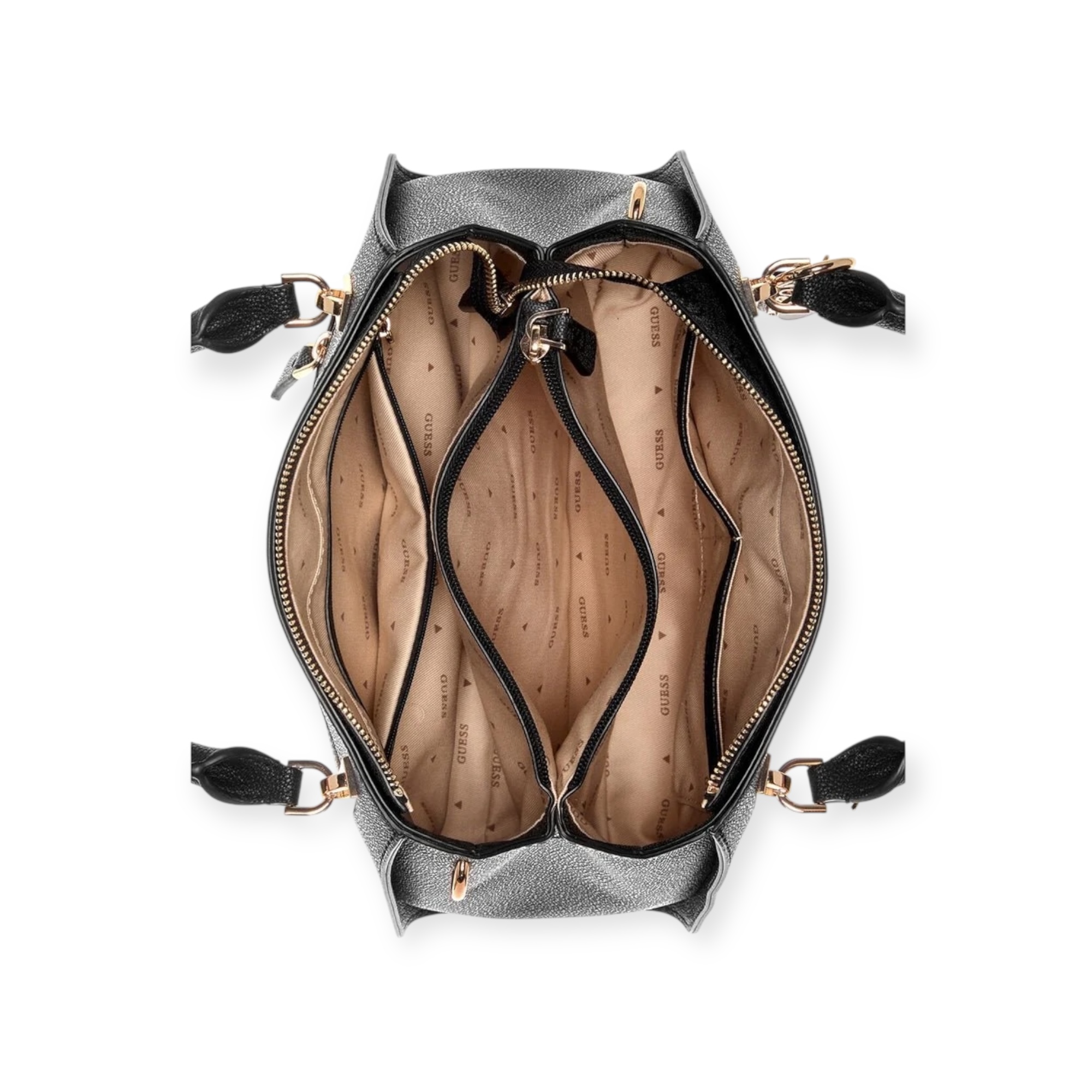 תיק guess  מראה יוקרתי עם הדפס לוגו ממותג, תליונים מוזהבים ורצועות כתף דקות ונוחות. חלוקה פנימית חכמה עם שלושה תאים גדולים, כולל תא עם רוכסן – מושלם ליום עמוס שדורש סדר וסטייל.