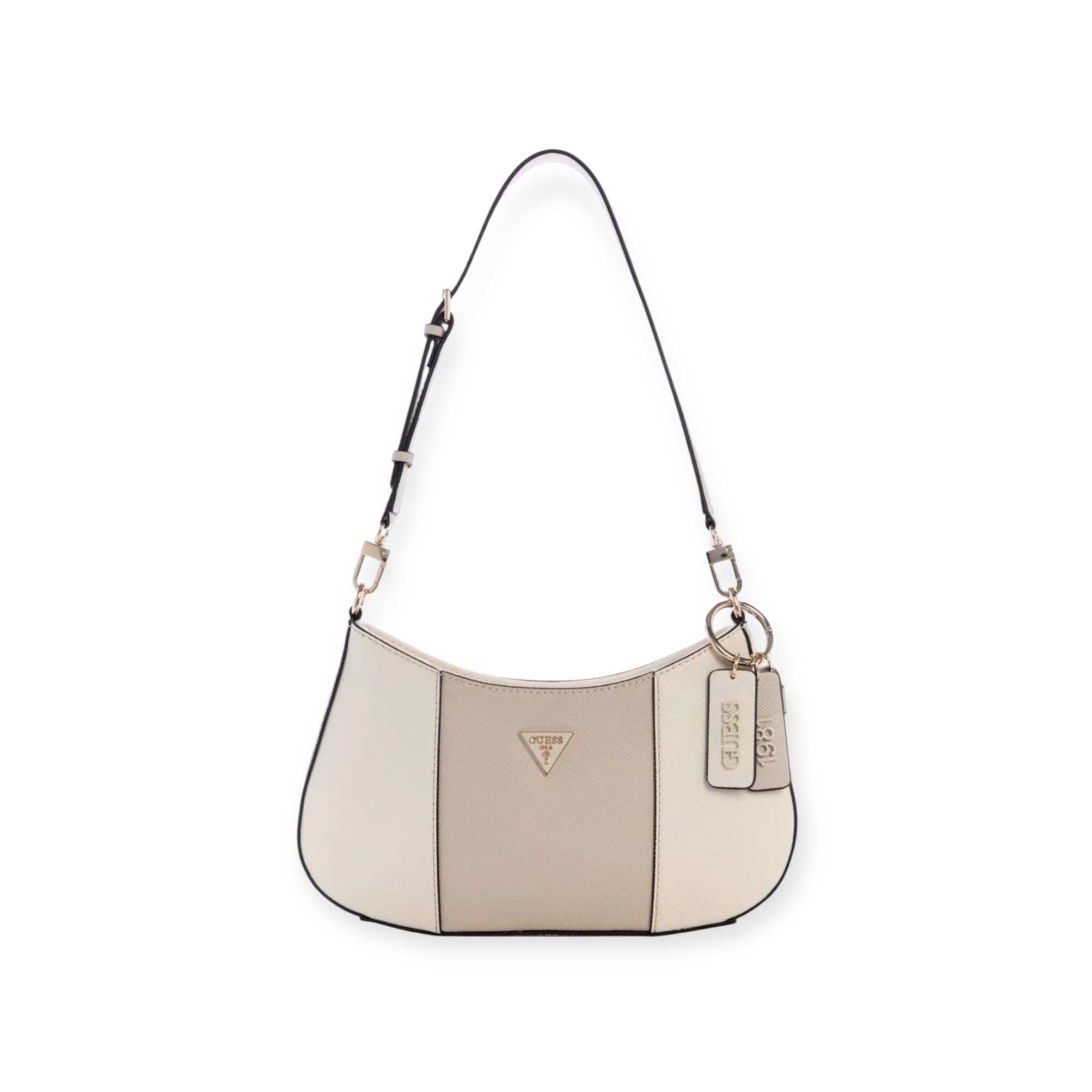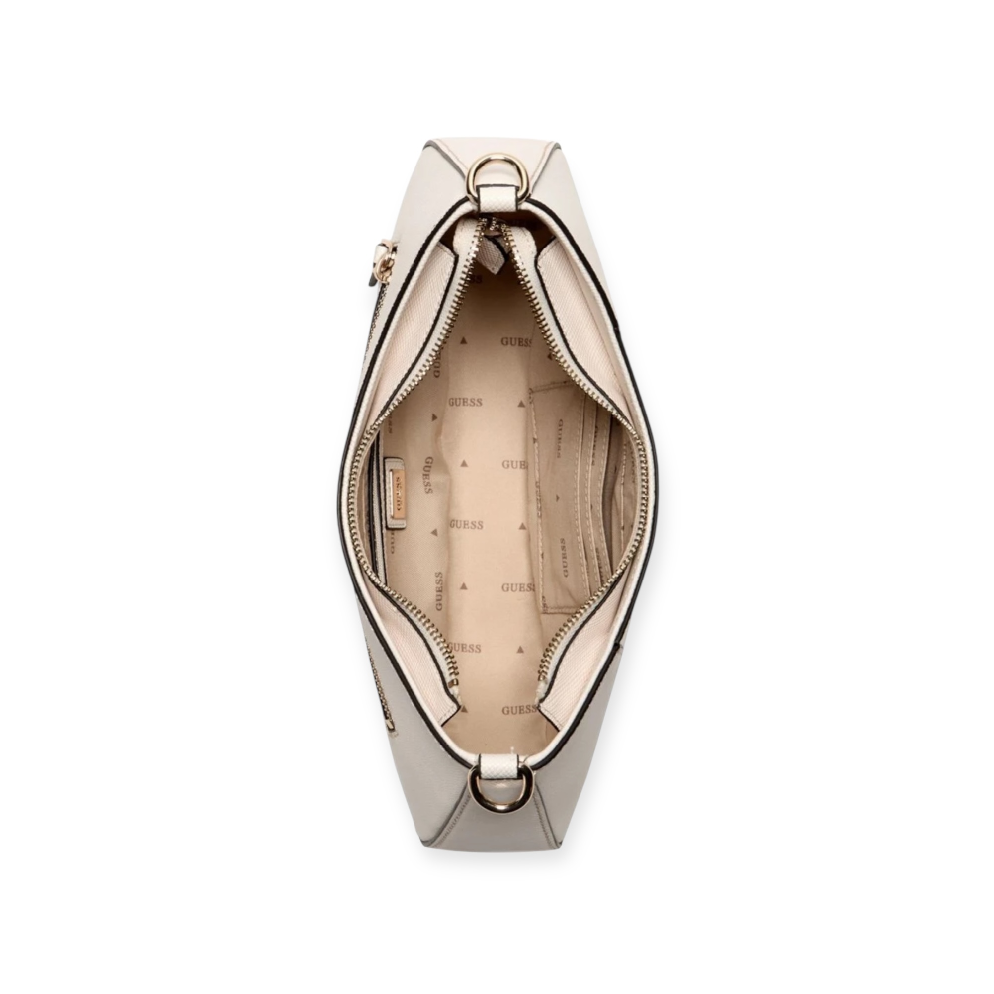 תיק guess דגם Top Zip Shoulder Bag – תיק כתף במבנה חצי ירח עם סגירת רוכסן עליונה, הדפס לוגו קלאסי ותליון מוזהב. עיצוב נשי ונוח שמתאים לכל לוק – בול לשימוש יומיומי או יציאה קלילה.