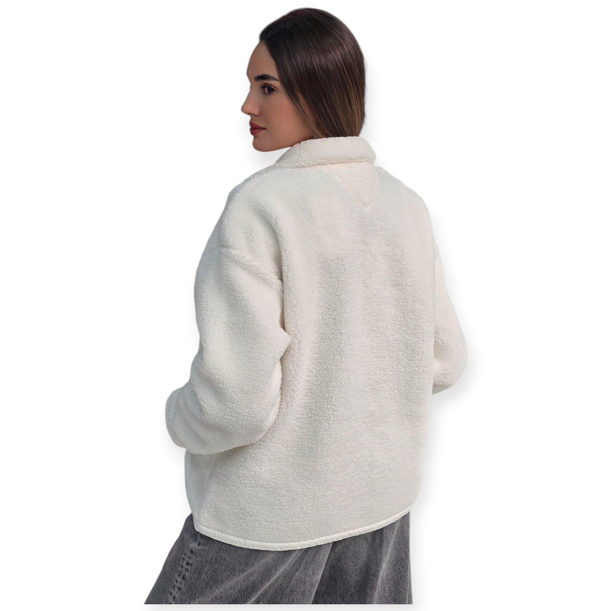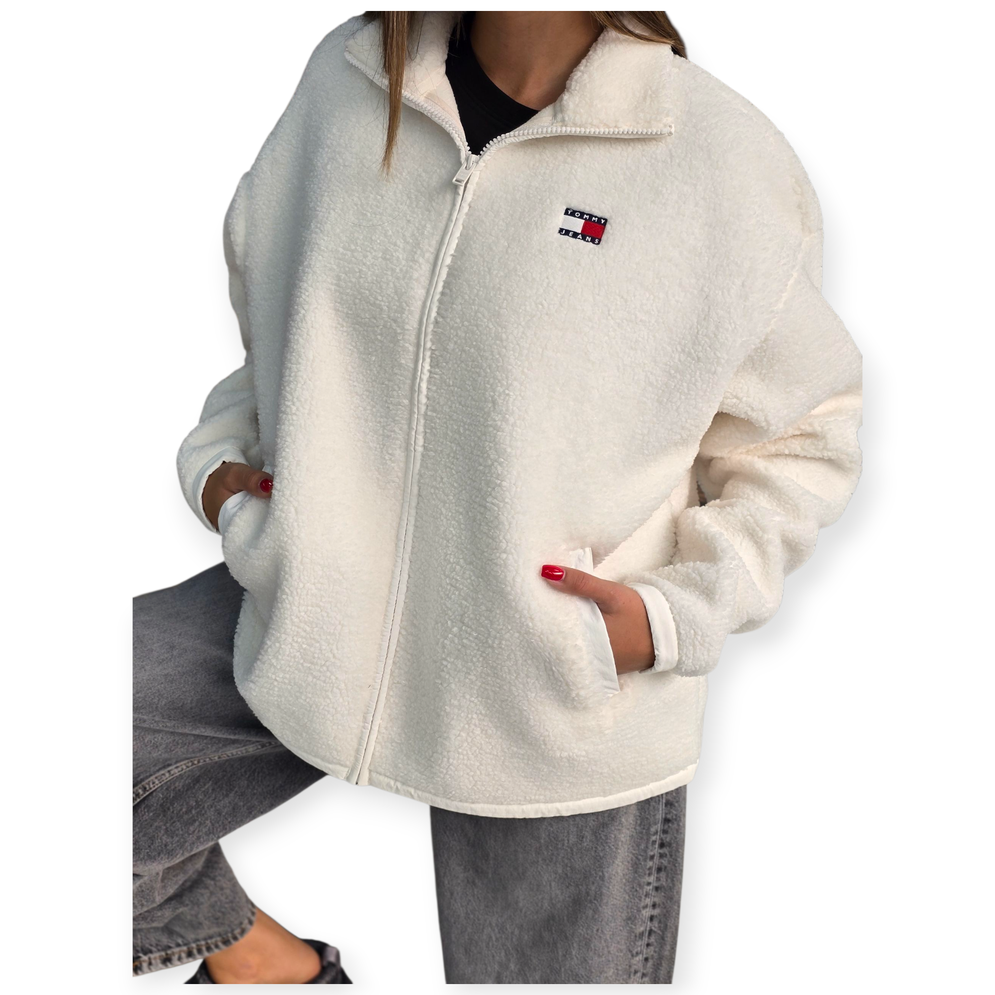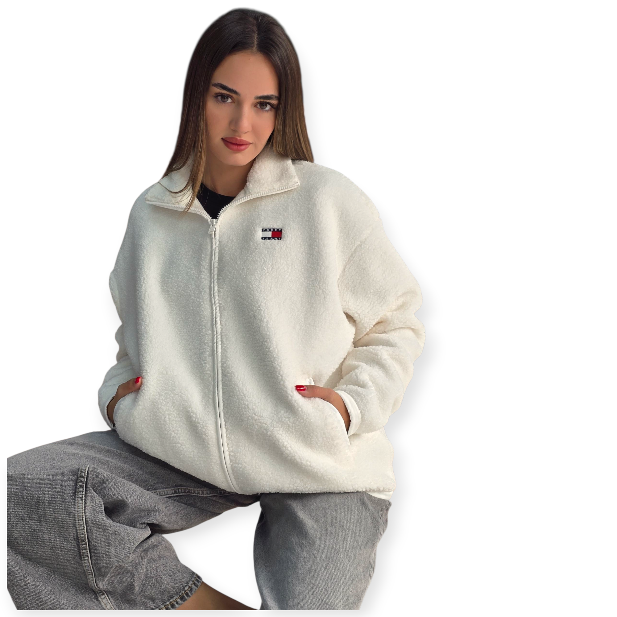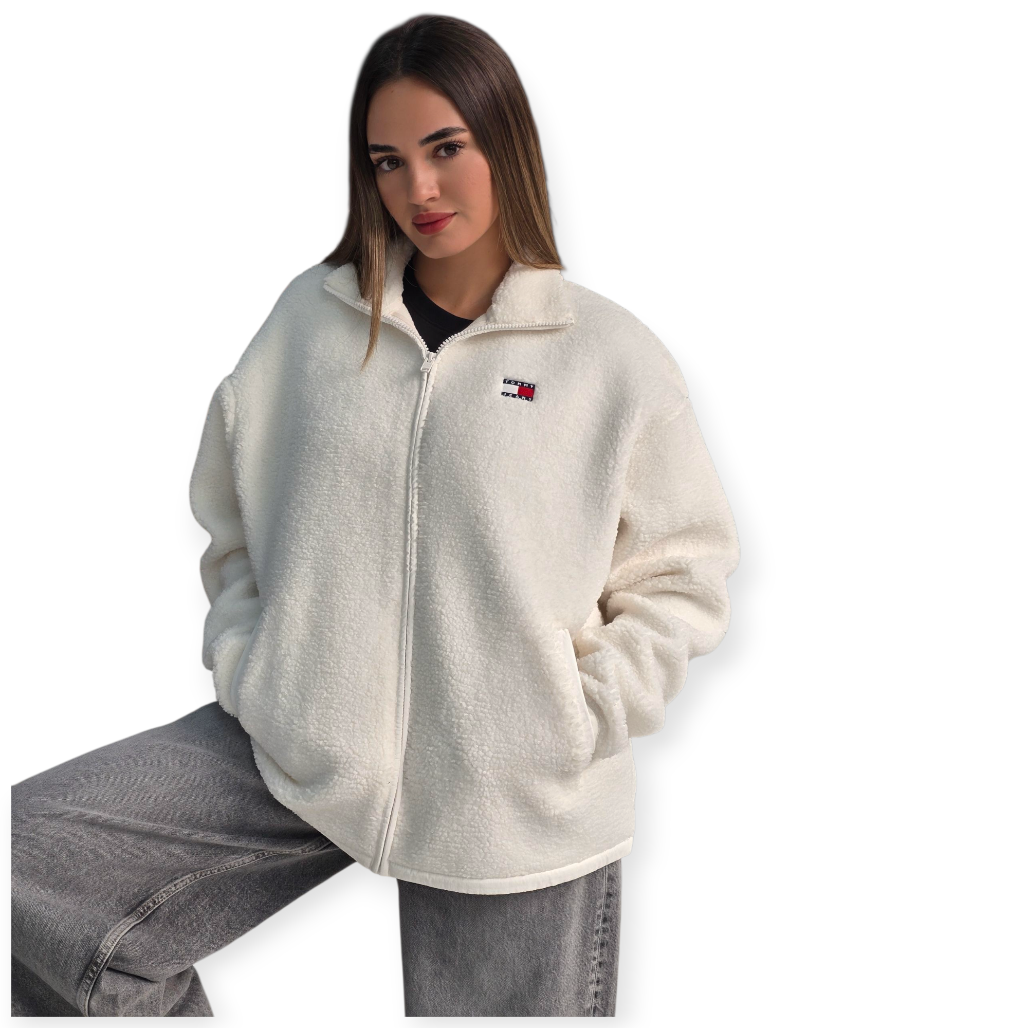 פליז נשים tommy hilfiger through badge teddy בגזרת רוכסן מלאה. בד טדי רך ונעים למגע, עם לוגו ממותג קטן בחזה – שילוב של חמימות, נוחות וסטייל יומיומי.