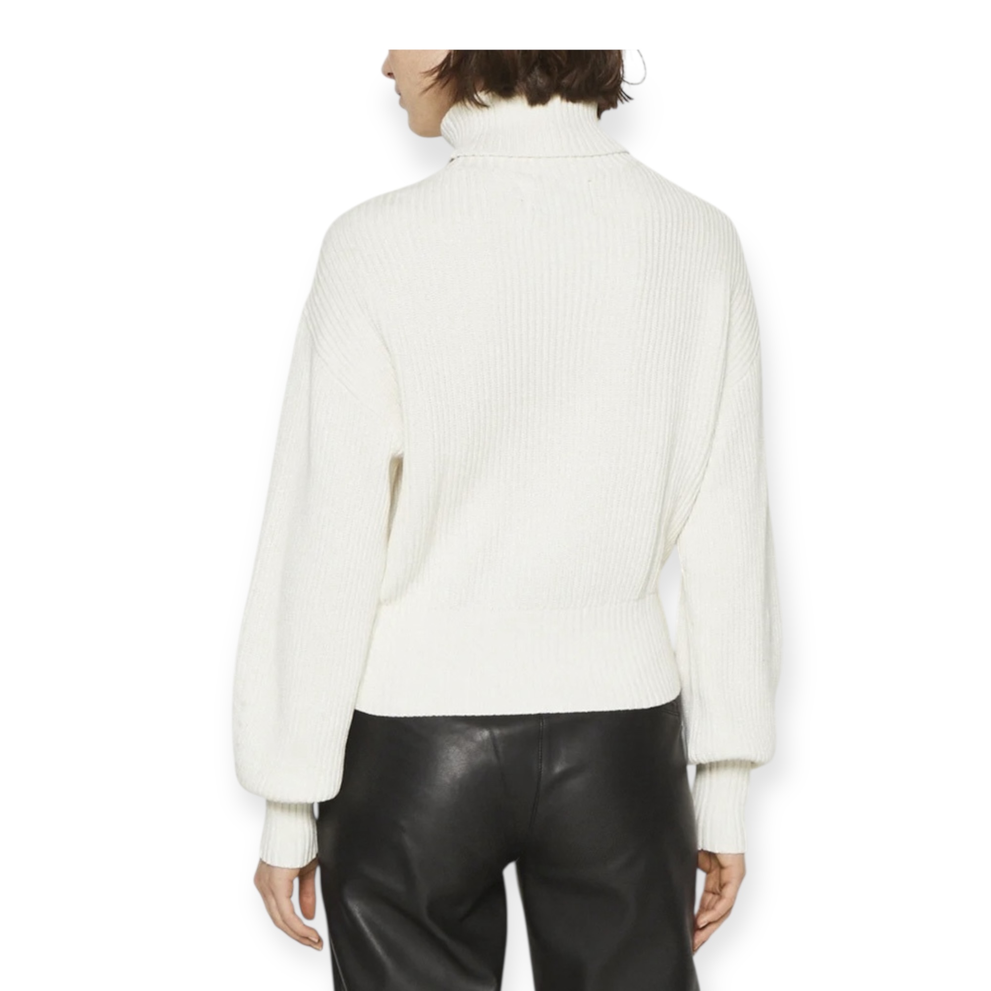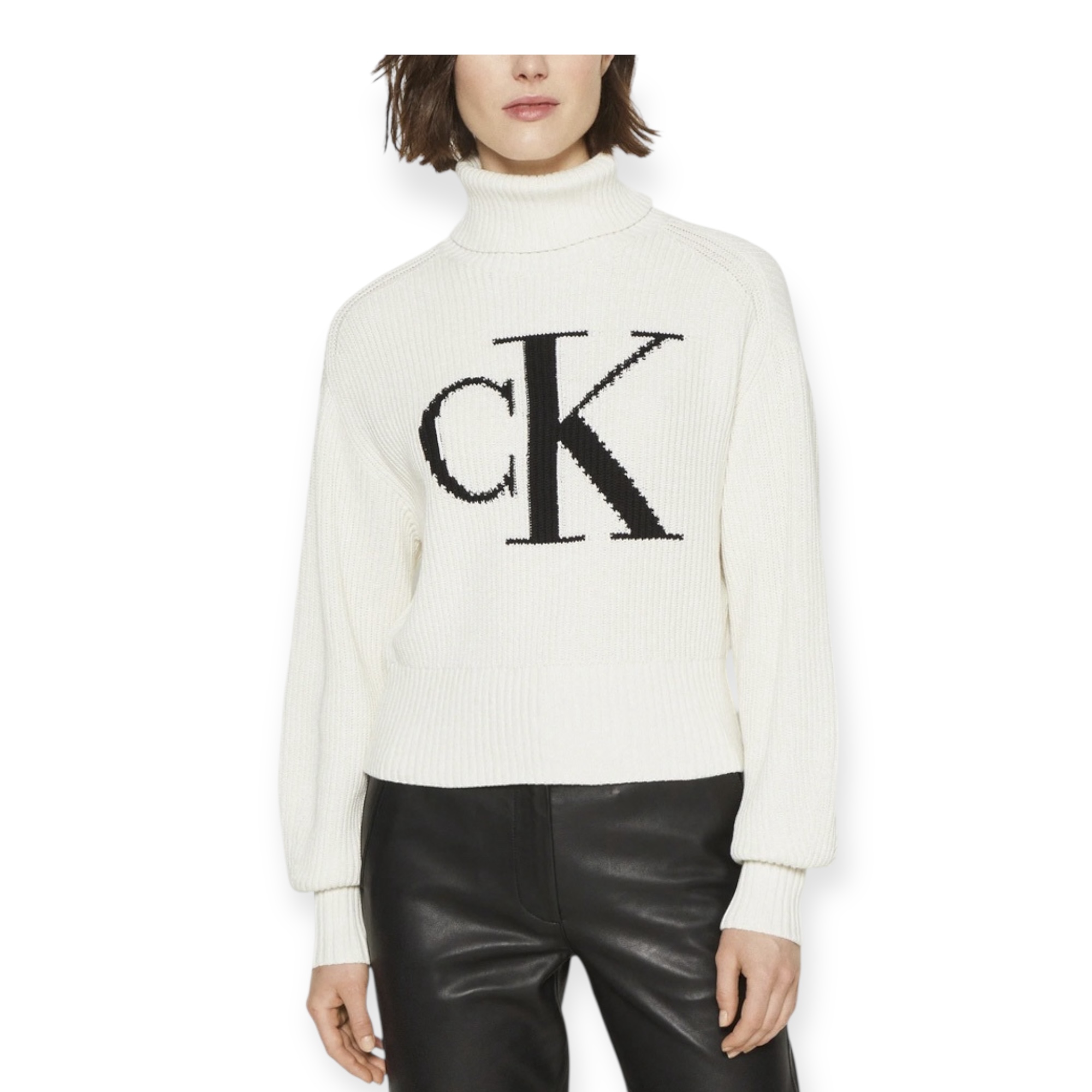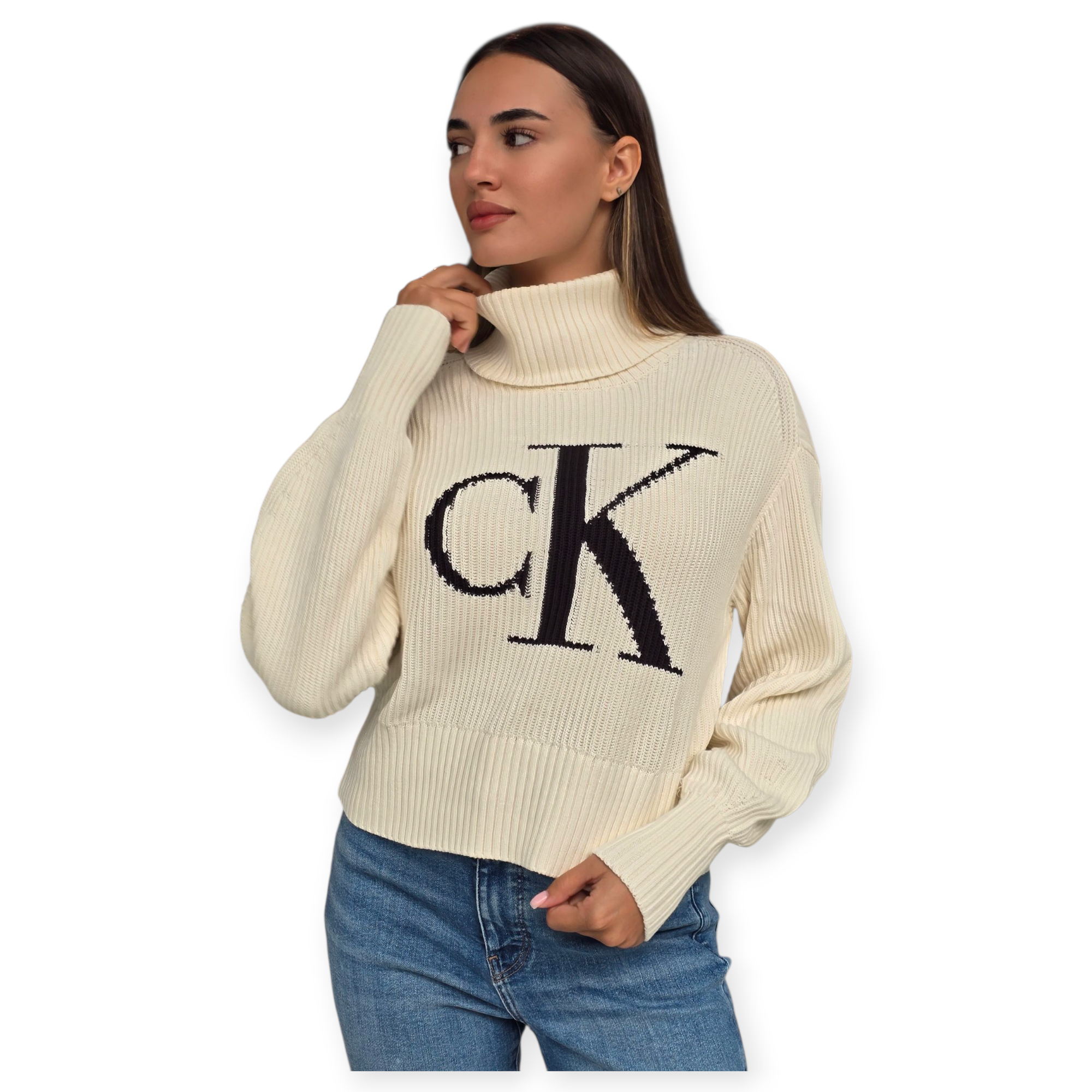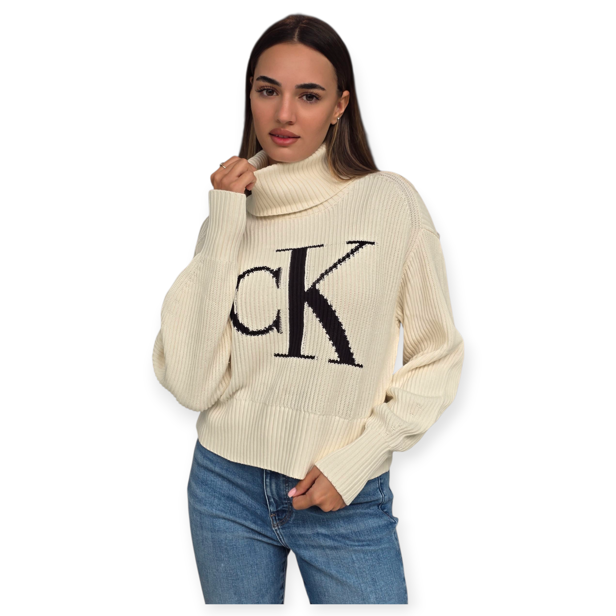 סוודר צווארון גבוה מבית calvin klein בגזרה משוחררת, בצבע לבן עם לוגו CK גדול ומודגש בחזית. סריג רך ונעים עם מראה יוקרתי – מושלם ללוק חורפי נקי ואלגנטי.