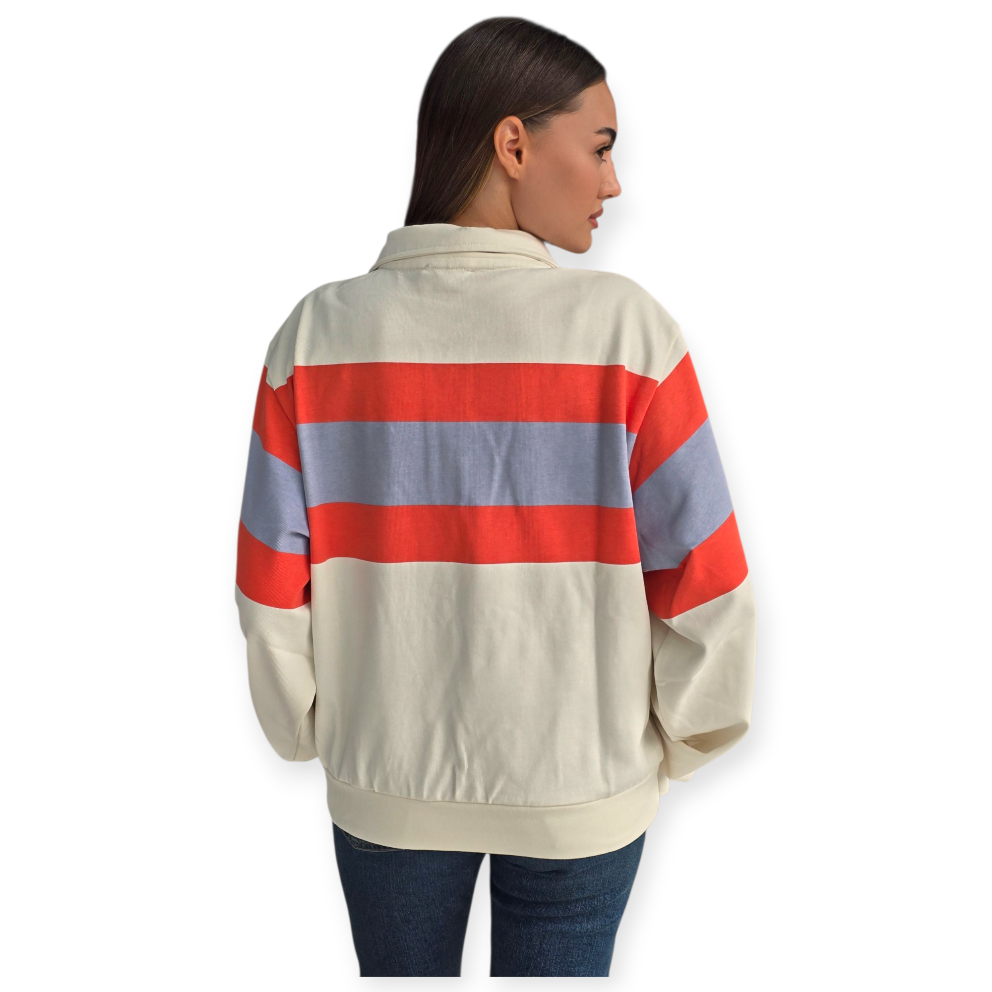 חולצת רוגבי מבית calvin klein עם רוכסן חצי, בצבע שמנת עם פסים רחבים באדום ותכלת. גזרה משוחררת, בד כותנה נעים ולוגו CK קטן בחזה – שילוב מושלם בין ספורטיביות לאופנה יומיומית טרנדית.