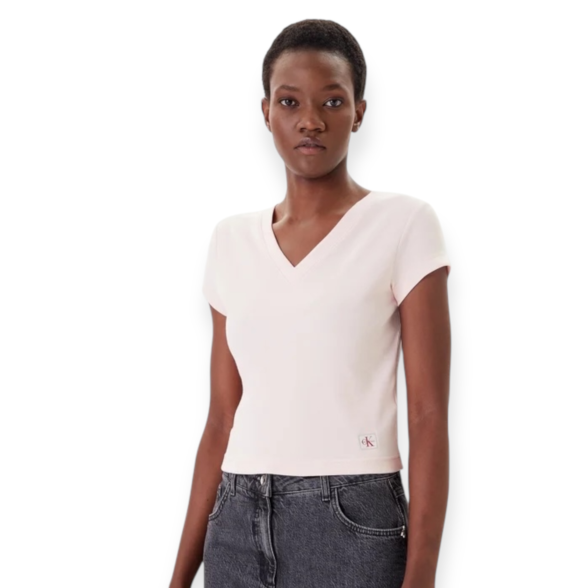 טי שירט צמודה לנשים V מבית calvin klein – מראה נקי עם לוגו קטן להשלמת הלוק.