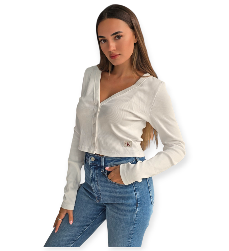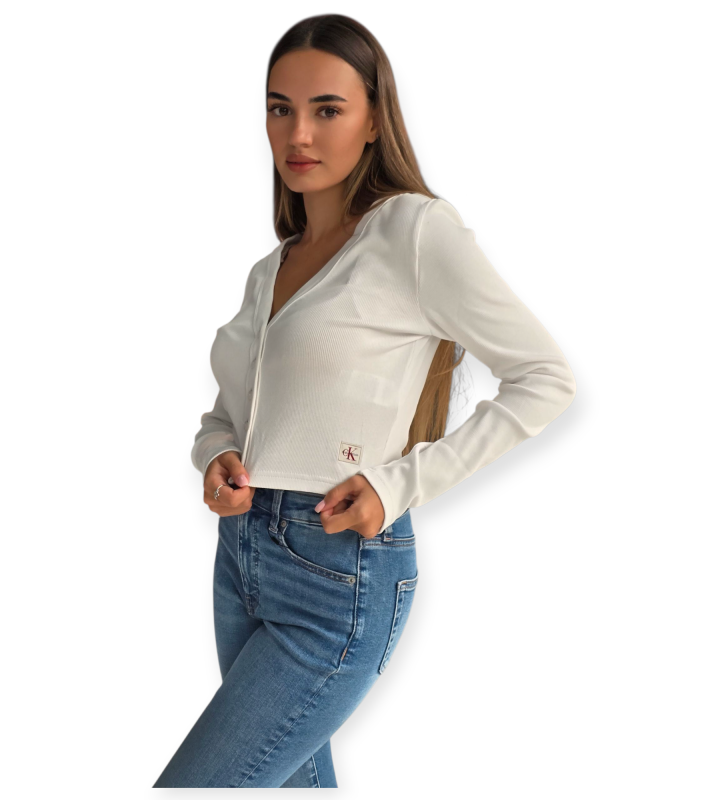 קרדיגן קצר מבית calvin klein בצבע לבן , עם כפתורים קדמיים ולוגו טלאי עדין בחזית. גזרת קרופ מחמיאה שמוסיפה טאץ’ מודרני ונועז – מושלם לשילוב מעל ג’ינס או חצאית לסטייל ערבוב בין אלגנטי לאורבני.