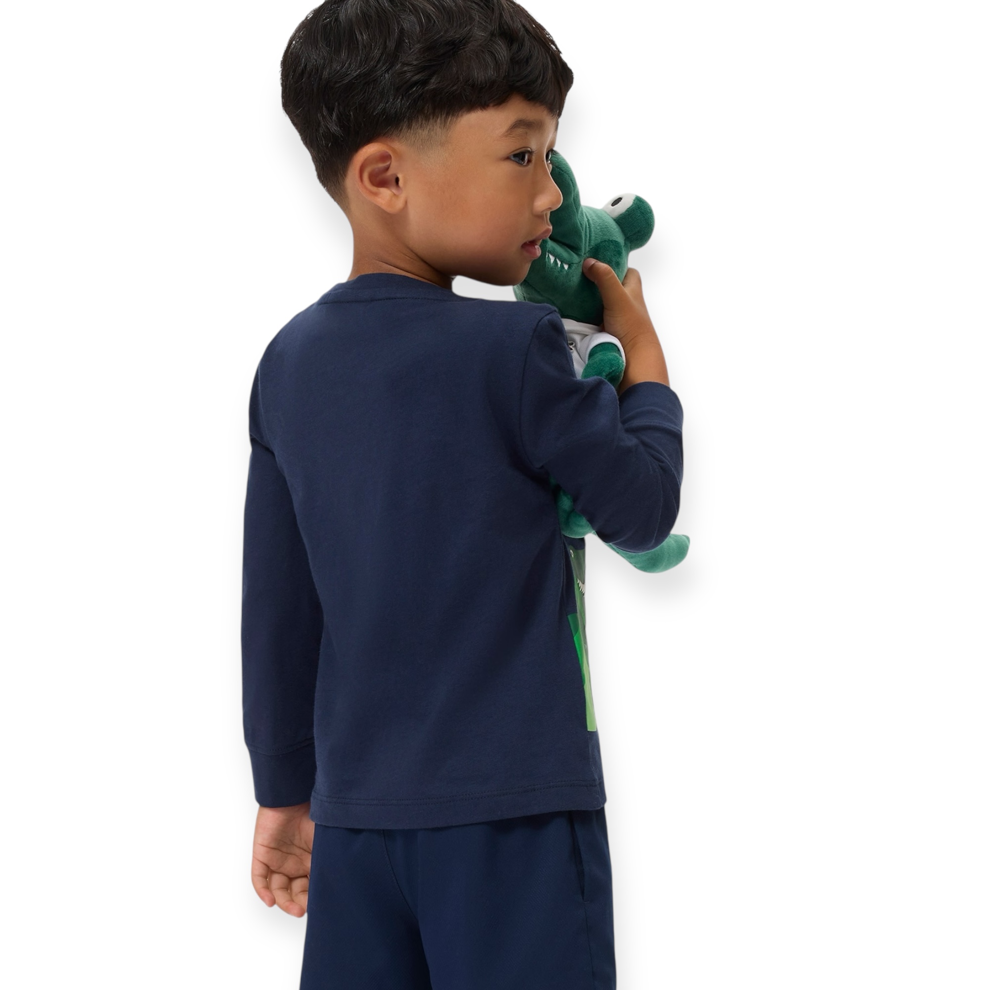 חולצת ילדים ארוכה lacoste מכותנה נעימה, עם הדפס קרוקודיל גדול ודומיננטי בצד ולוגו אייקוני קטן בחזה. שילוב של נוחות יומיומית וסטייל playful.