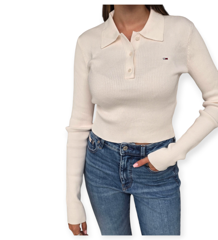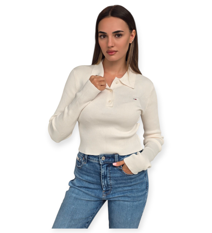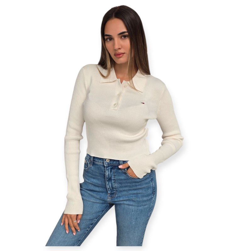 סוודר פיקה ריב מבית tommy hilfiger בגזרת פולו ארוכה עם צווארון וכפתורים, בשחור קלאסי עם לוגו רקום קטן בחזה. שילוב מושלם בין אלגנטיות יומיומית לנוחות, מתאים עם חצאית או ג’ינס לכל עונה.