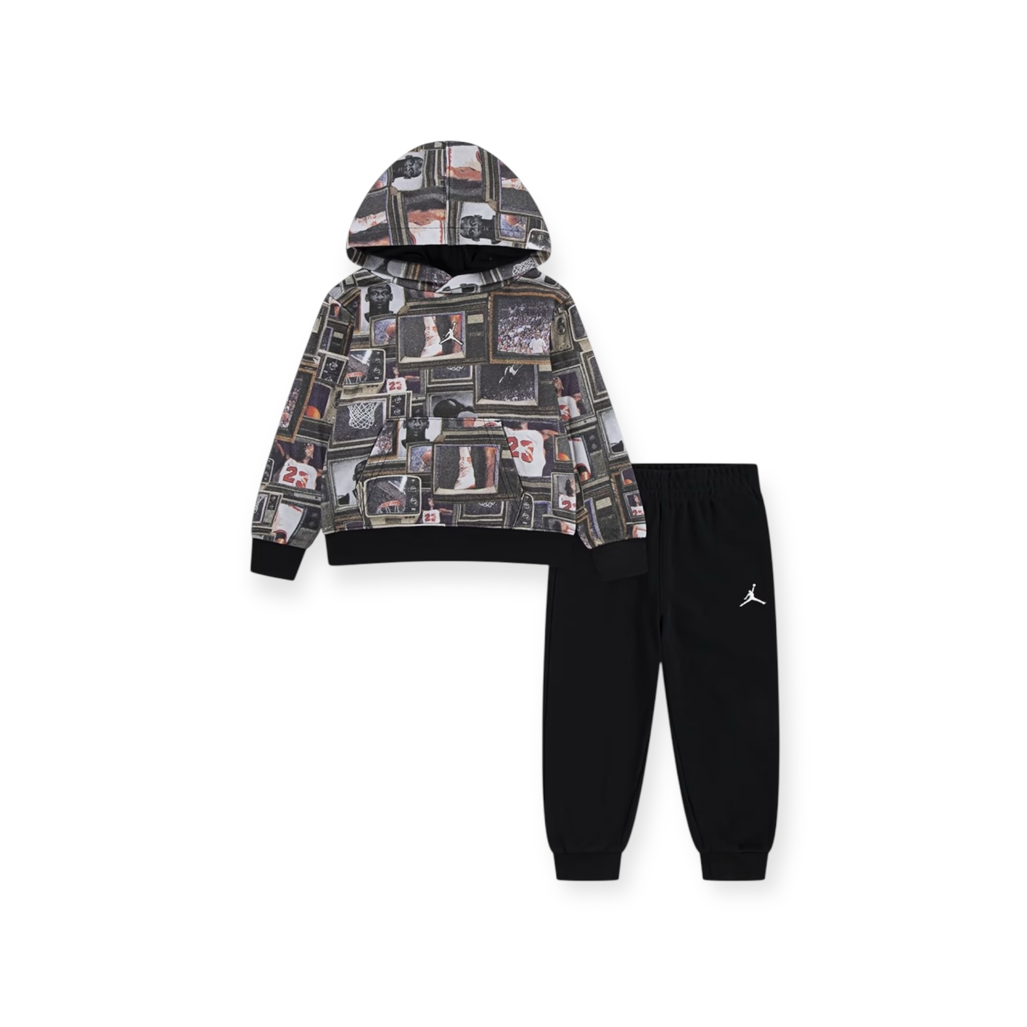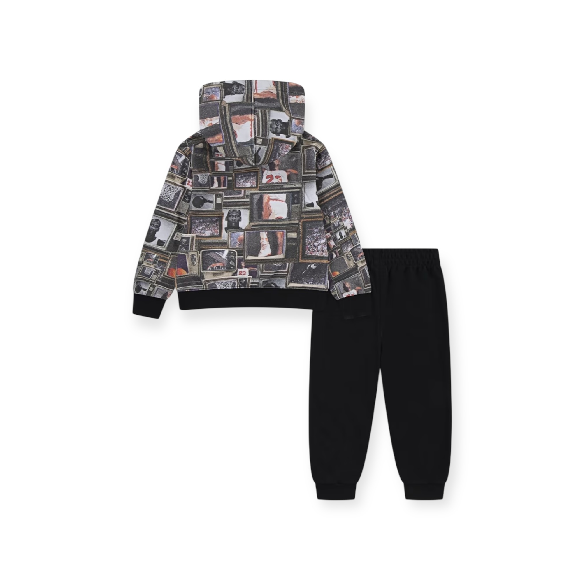 חליפת ילדים של jordan – סט הכולל קפוצ’ון עם הדפס גרפיטי צבעוני ומכנסי ג’וגר שחורים עם לוגו ה־Jumpman. נוחות מקסימלית עם סטייל של אגדה.