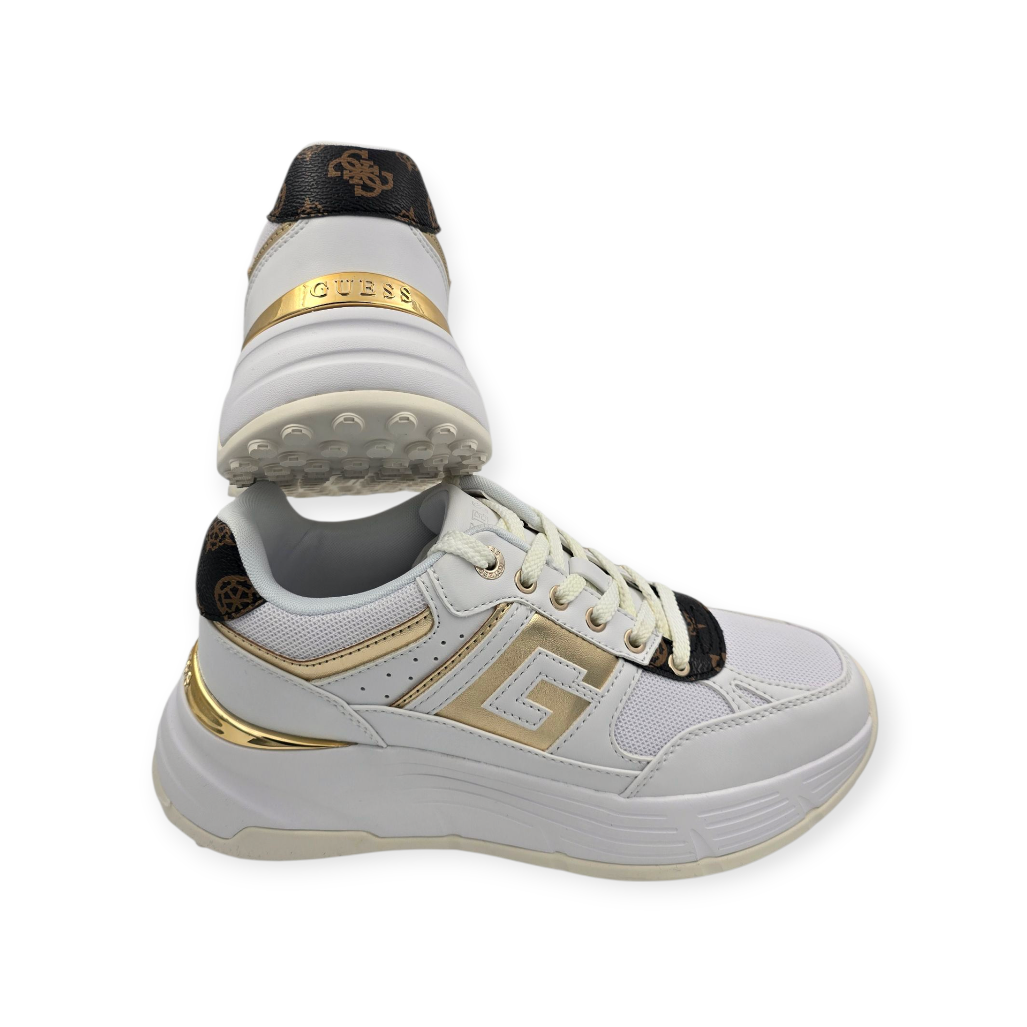 סניקרס פלטפורמה ייחודיות לנשים מבית guess, בעיצוב טרנדי עם שילובי זהב ולבן לנראות יוקרתית ומושכת.