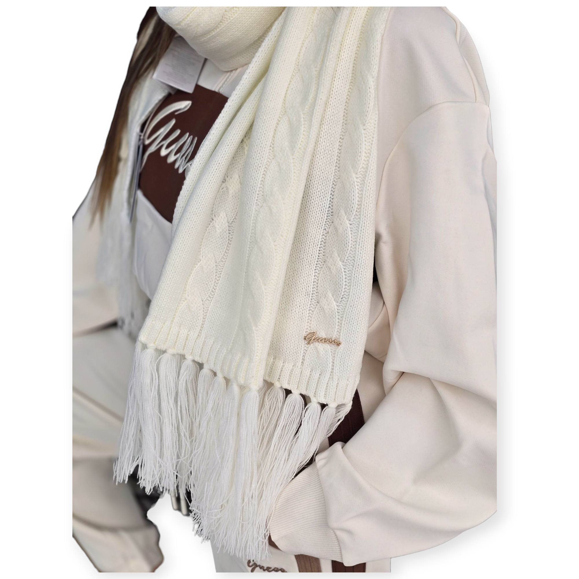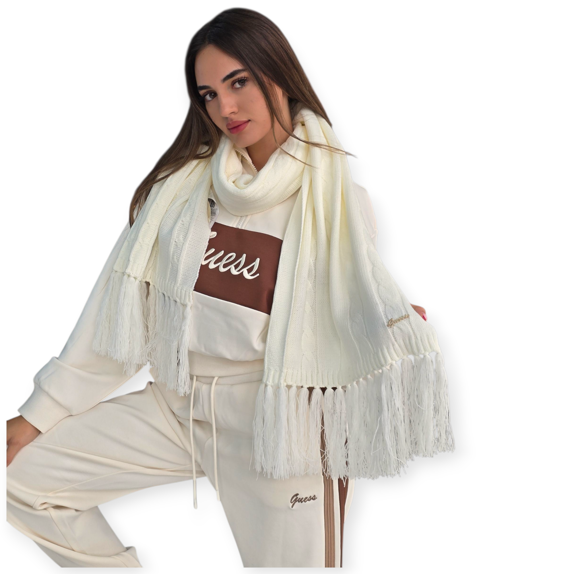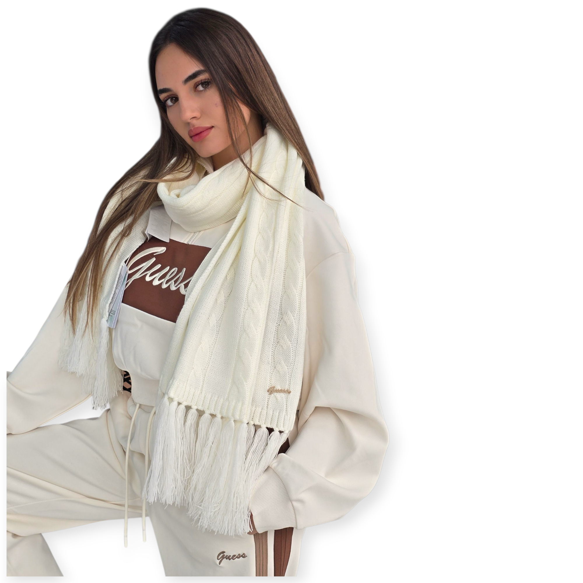 צעיף נעים ומחמם של guess בעיצוב יוקרתי עם לוגו גדול ומרשים וסיומת פרנזים בחלק התחתון. מושלם להשלמת כל לוק חורפי ולתחושת רכות ונוחות ביום קר.