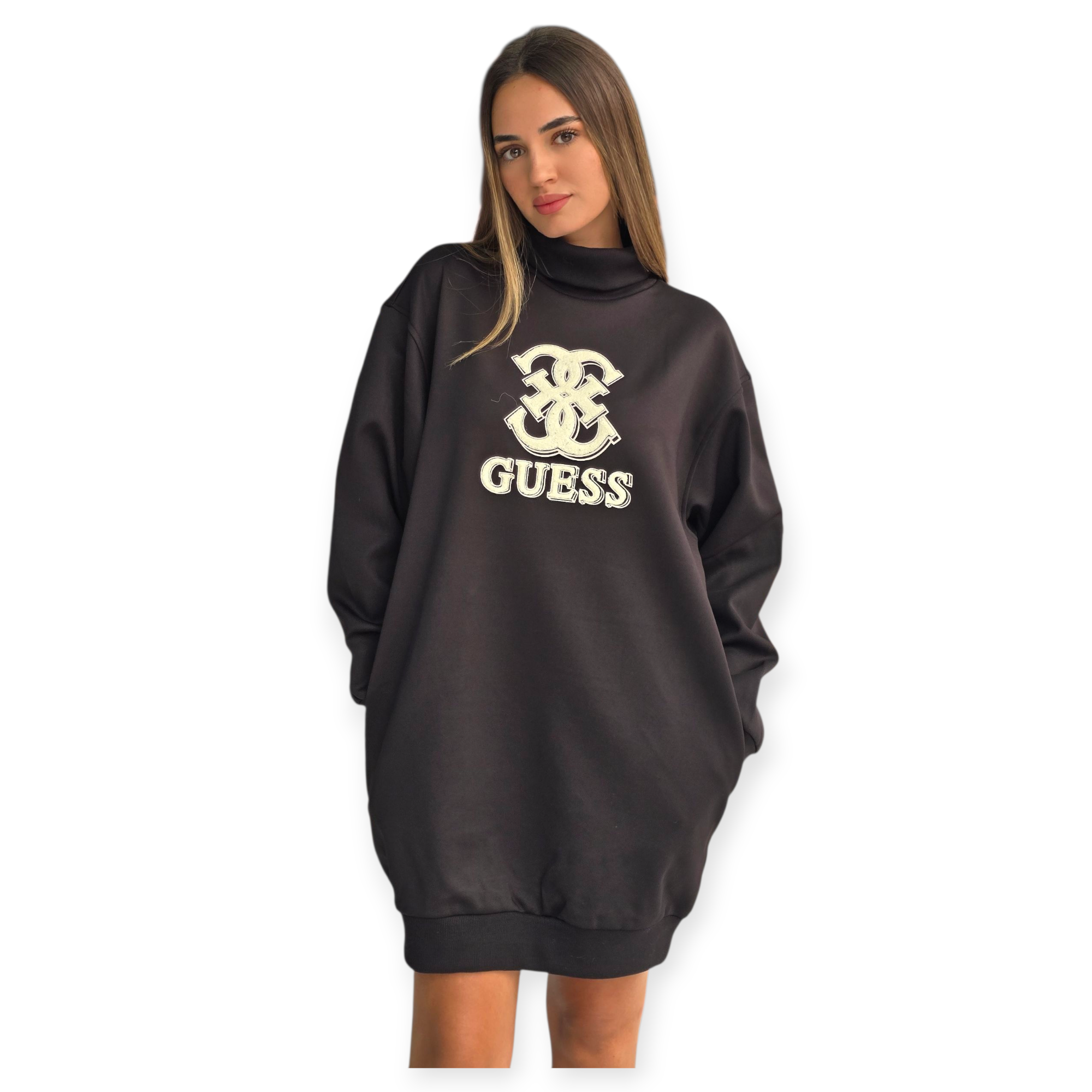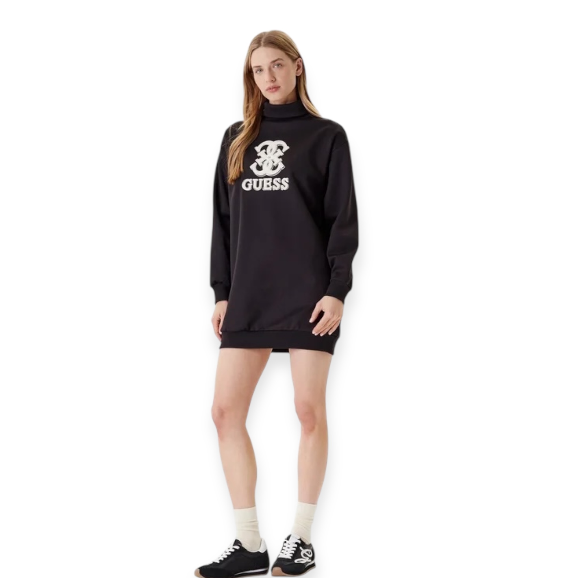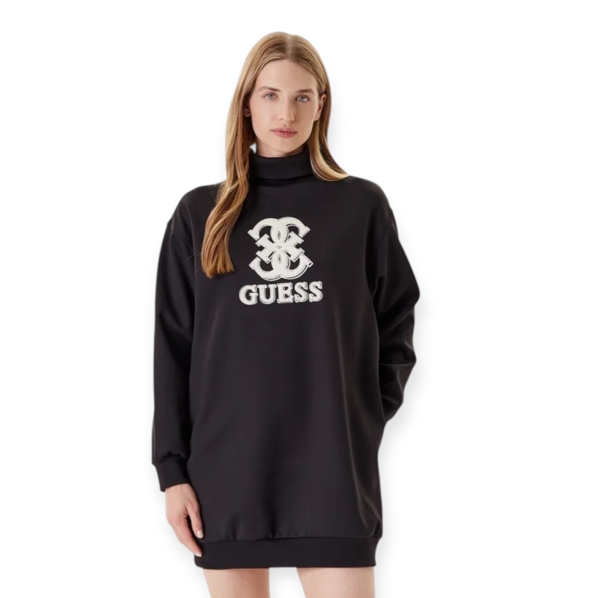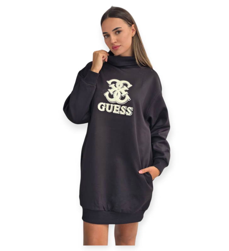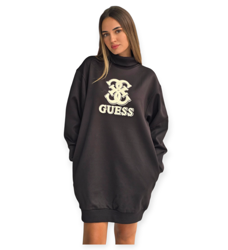 שמלת קז’ואל מבית guess עם גזרה משוחררת, צווארון גבוה ולוגו רקום בחזית. שילוב מושלם בין נוחות לסטייל יומיומי.
