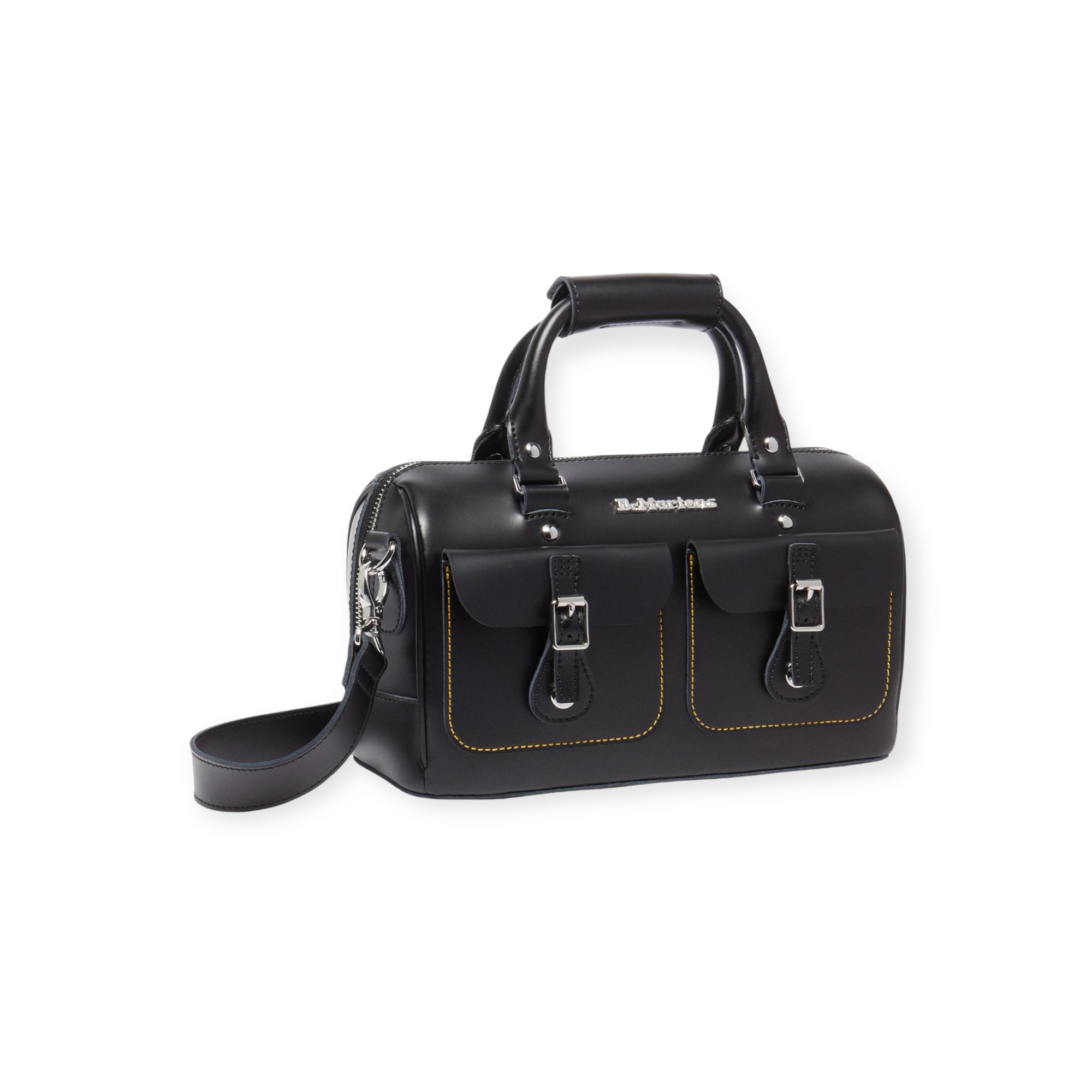 dr. martens – תיק יד מלבני בסגנון duffle שחור עם ידיות נשיאה ורצועת כתף מתכווננת, כיסים קדמיים עם אבזמים ותפרים צהובים