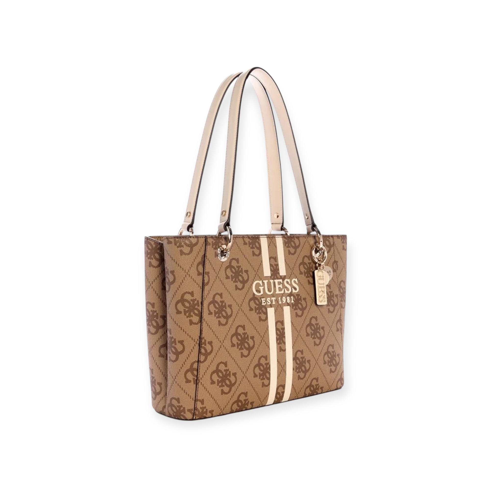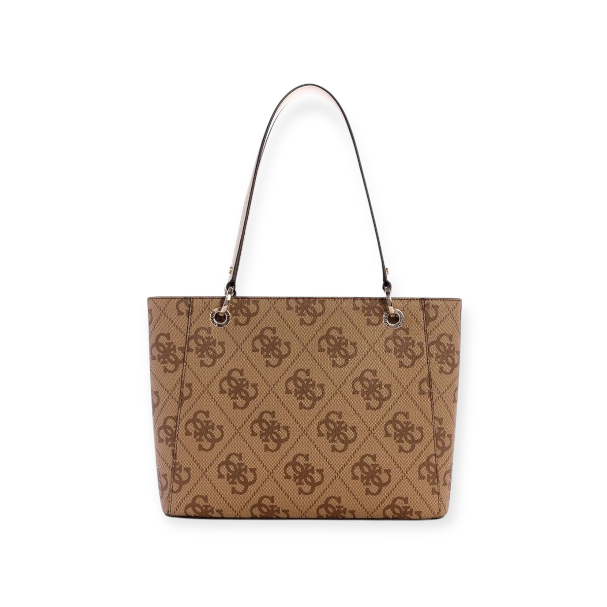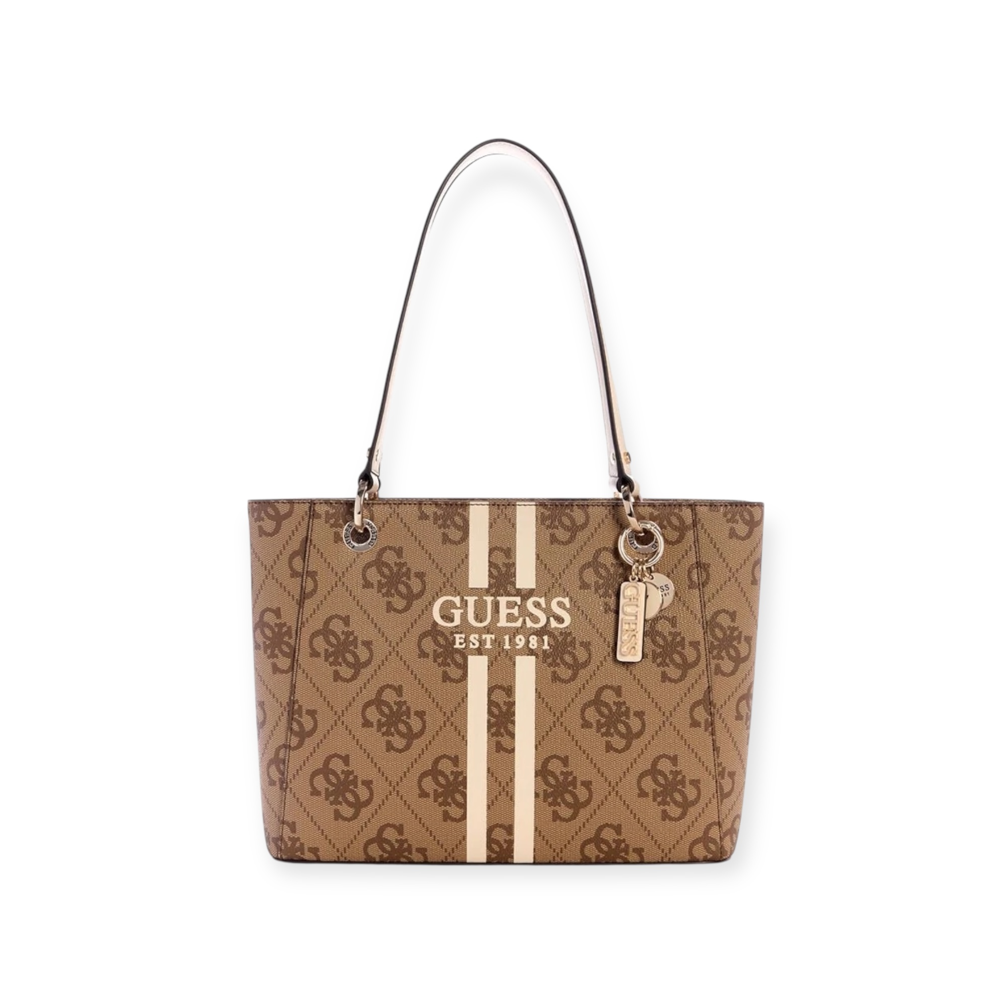 תיק guess דגם Small Tote – מראה יוקרתי עם הדפס לוגו ממותג, תליונים מוזהבים ורצועות כתף דקות ונוחות. חלוקה פנימית חכמה עם שלושה תאים גדולים, כולל תא עם רוכסן – מושלם ליום עמוס שדורש סדר וסטייל.